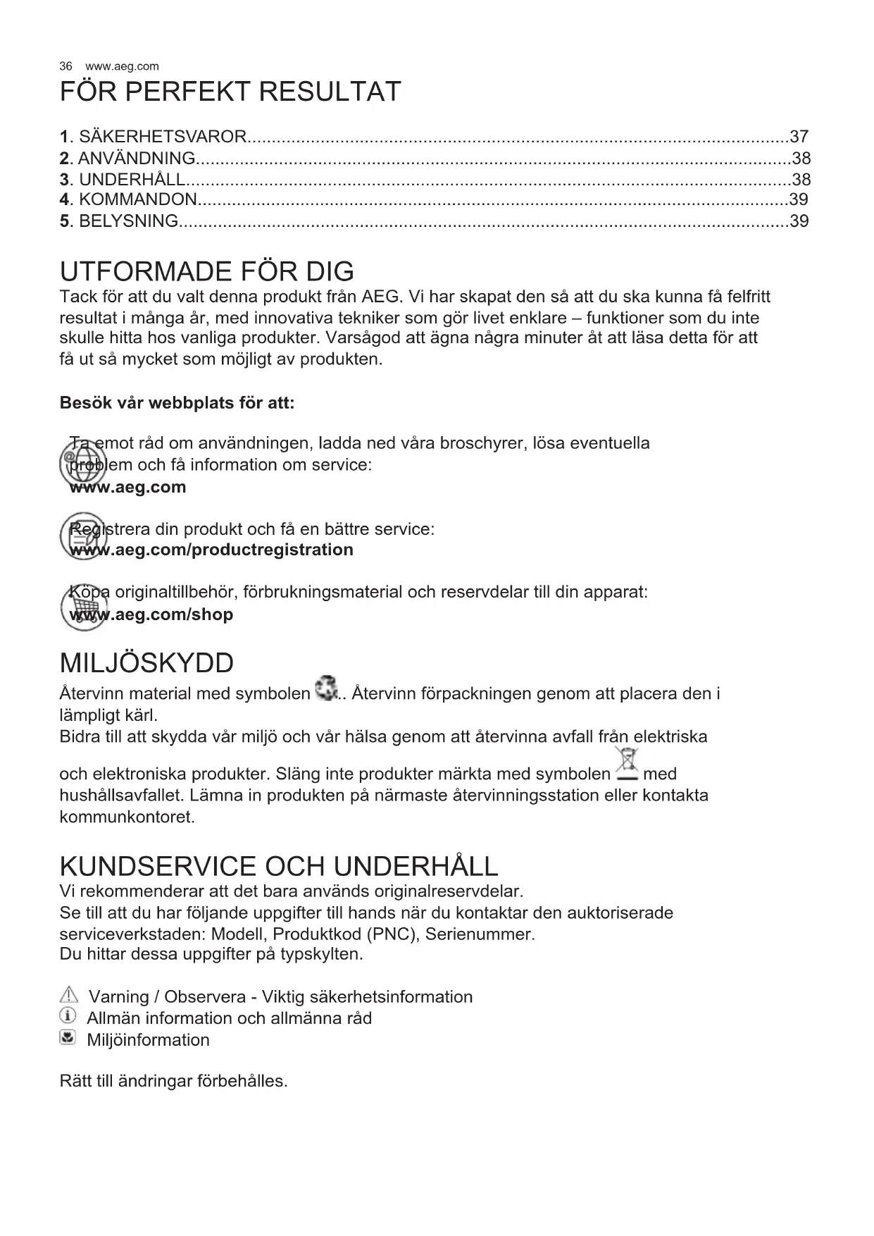 Vi rekommenderar att det bara används originalreservdelar. Se till att du har följande uppgifter till hands när du kontaktar den auktoriserade serviceverkstaden: Modell, Produktkod (PNC), Serienummer. Du hittar dessa uppgifter på typskylten. Varning / Observera - Viktig säkerhetsinformation Allmän information och allmänna råd Miljöinformation Rätt till ändringar förbehålles.37 SVENSKA