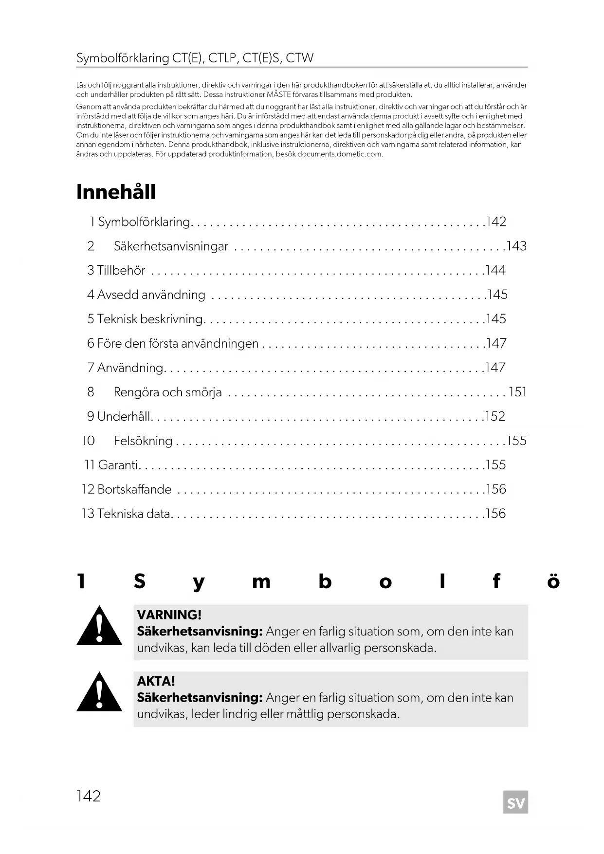 - Läs och följ noggrant alla instruktioner, direktiv och varningar i den här produkthandboken för att säkerställa att du alltid installerar, använder och underhåller produkten på rätt sätt. Dessa instruktioner MÅSTE förvaras tillsammans med produkten. Genom att använda produkten bekräftar du härmed att du noggrant har läst alla instruktioner, direktiv och varningar och att du förstår och är införstådd med att följa de villkor som anges häri. Du är införstådd med att endast använda denna produkt i avsett syfte och i enlighet med instruktionerna, direktiven och varningarna som anges i denna produkthandbok samt i enlighet med alla gällande lagar och bestämmelser. Om du inte läser och följer instruktionerna och varningarna som anges här kan det leda till personskador på dig eller andra, på produkten eller annan egendom i närheten. Denna produkthandbok, inklusive instruktionerna, direktiven och varningarna samt relaterad information, kan ändras och uppdateras. För uppdaterad produktinformation, besök documents.dometic.com. Innehåll 1 Symbolförklaring p. 142