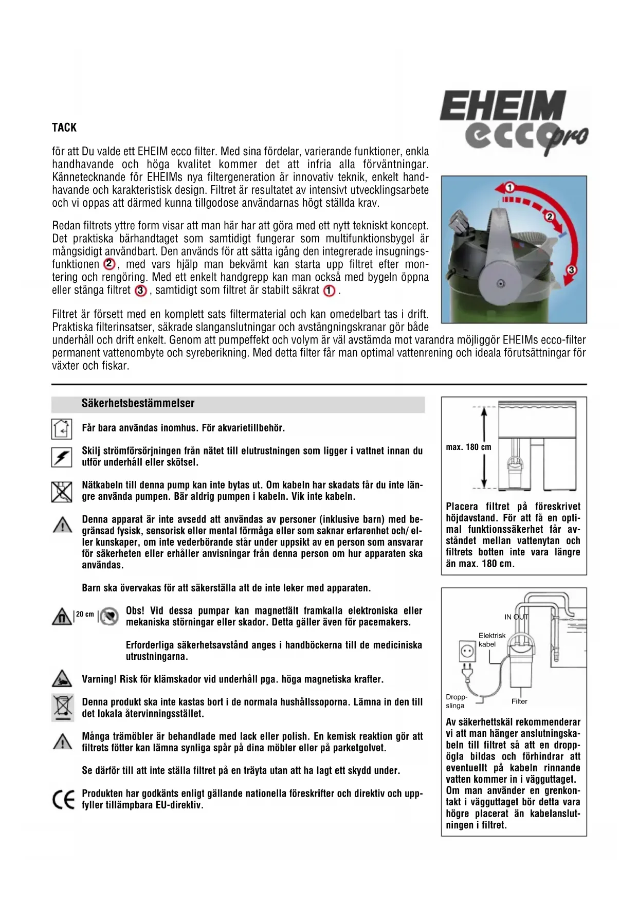 ko zh bg ru tr ro sl sk pl hu cs el pt es it da fi no sv nl fr en deTACK för att Du valde ett EHEIM ecco filter. Med sina fördelar, varierande funktioner, enkla handhavande och höga kvalitet kommer det att infria alla förväntningar. Kännetecknande för EHEIMs nya filtergeneration är innovativ teknik, enkelt hand- havande och karakteristisk design. Filtret är resultatet av intensivt utvecklingsarbete och vi oppas att därmed kunna tillgodose användarnas högt ställda krav. Redan filtrets yttre form visar att man här har att göra med ett nytt tekniskt koncept. Det praktiska bärhandtaget som samtidigt fungerar som multifunktionsbygel är mångsidigt användbart. Den används för att sätta igång den integrerade insugnings- funktionen , med vars hjälp man bekvämt kan starta upp filtret efter mon- tering och rengöring. Med ett enkelt handgrepp kan man också med bygeln öppna eller stänga filtret , samtidigt som filtret är stabilt säkrat . Filtret är försett med en komplett sats filtermaterial och kan omedelbart tas i drift. Praktiska filterinsatser, säkrade slanganslutningar och avstängningskranar gör både underhåll och drift enkelt. Genom att pumpeffekt och volym är väl avstämda mot varandra möjliggör EHEIMs ecco-filter permanent vattenombyte och syreberikning. Med detta filter får man optimal vattenrening och ideala förutsättningar för växter och fiskar.