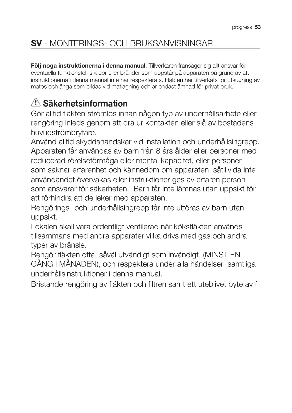 Följ noga instruktionerna i denna manual. Tillverkaren frånsäger sig allt ansvar för eventuella funktionsfel, skador eller bränder som uppstår på apparaten på grund av att instruktionerna i denna manual inte har respekterats. Fläkten har tillverkats för utsugning av matos och ånga som bildas vid matlagning och är endast ämnad för privat bruk. Säkerhetsinformation Gör alltid fläkten strömlös innan någon typ av underhållsarbete eller rengöring inleds genom att dra ur kontakten eller slå av bostadens huvudströmbrytare. Använd alltid skyddshandskar vid installation och underhållsingrepp. Apparaten får användas av barn från 8 års ålder eller personer med reducerad rörelseförmåga eller mental kapacitet, eller personer som saknar erfarenhet och kännedom om apparaten, såtillvida inte användandet övervakas eller instruktioner ges av erfaren person som ansvarar för säkerheten. Barn får inte lämnas utan uppsikt för att förhindra att de leker med apparaten. Rengörings och underhållsingrepp får inte utföras av barn utan uppsikt. Lokalen skall vara ordentligt ventilerad när köksfläkten används tillsammans med andra apparater vilka drivs med gas och andra typer av bränsle. Rengör fläkten ofta, såväl utvändigt som invändigt, (MINST EN GÅNG I MÅNADEN), och respektera under alla händelser samtliga underhållsinstruktioner i denna manual. Bristande rengöring av fläkten och filtren samt ett uteblivet byte av f54 progress Säkerhetsinstruktioner Använd endast den typ av lampor som anges i denna handbok i kapitles Underhåll/ Byte av lampa när lampan skall bytas ut. Varning! Anslut inte apparaten till elnätet innan installationen är helt slutförd. Vad beträffar de tekniska föreskrifter och säkerhetsåtgärder som skall vidtas för avledning av utblåsningsluften, skall de föreskrifter som utfärdats av lokala myndigheter noga efterlevas. Utblåsningsluften får inte ledas in i rökkanal som används för avledning av rökångor som kommer från apparater vilka matas med gas eller andra typer av bränsle. Använd eller lämna aldrig fläkten utan korrekt imonterade lampor för att undvika risken för elektriska stötar. Fläkten får aldrig användas utan att gallret är korrekt monterat! Fläkten får ALDRIG användas som avställningsyta om inte detta är uttryckligen angivet. Använd endast de medlevererade fixeringsskruvarna eller införskaffa skruvar av korrekt typ. Använd skruvar med rätt längd enligt föreskrifterna i Installationsguiden. I händelse av tvivel, kontakta Servicekontoret eller behörig personal. Varning! I det fall skruvar och fixeringsanordningar inte installeras enligt dessa instruktioner kan elektriska risker uppstå. Miljöskydd Återvinn material med symbolen . Återvinn förpackningen genom att placera den i lämpligt kärl. Bidra till att skydda vår miljö och vår hälsa genom att återvinna avfall från elektriska och elektroniska produkter. Släng inte produkter märkta med symbolen med hushållsavfallet. Lämna in produkten på närmaste återvinningsstation eller kontakta kommunkontoret. Användning Installation Fläkten har tillverkats för att användas som utsugningsversion med utvändig evakuering eller som filterversion med intern återcirkulation . Installation Nätspänningen skall motsvara spänningen som anges på märkplåten som sitter inne i fläkten. Om fläkten är utrustad med stickkontakt skall denna anslutas till ett uttag som är lättillgängligt även efter installationen och som uppfyller gällande föreskrifter. I det fall fläkten saknar stickkontakt (direktanslutning till nätet), eller om uttaget är placerat på en svåråtkomlig plats skall en godkänd tvåpolig strömbrytare installeras som garanterar en fullkomlig frånkoppling från nätet i samband med överspänningsklass III, i enlighet med installationsbestämmelserna. Varning!kontrollera innan fläktens krets ansluts med nätspänningen att den fungerar korrekt och är korrekt monterad.progress 55 Fläkten är försedd med en speciell elkabel, kontakta därför vårt tekniska servicekontor i det kabeln skadats. Minsta tillåtna avstånd mellan kokkärlens stödyta på spishällen och köksfläktes underkant är 50cm om det är frågan om en elektrisk spis och 65cm om det är frågan om gasspis eller kombinerad gashäll. Om spishällens instruktioner anger ett större avstånd skall detta respekteras. Funktion Använd en högre hastighet om matoset är mycket koncentrerat. Vi rekommenderar att starta luftevakueringen 5 minuter innan matlagningen inleds och låta den fungera i cirka 15 minuter efter avslutad matlagning.