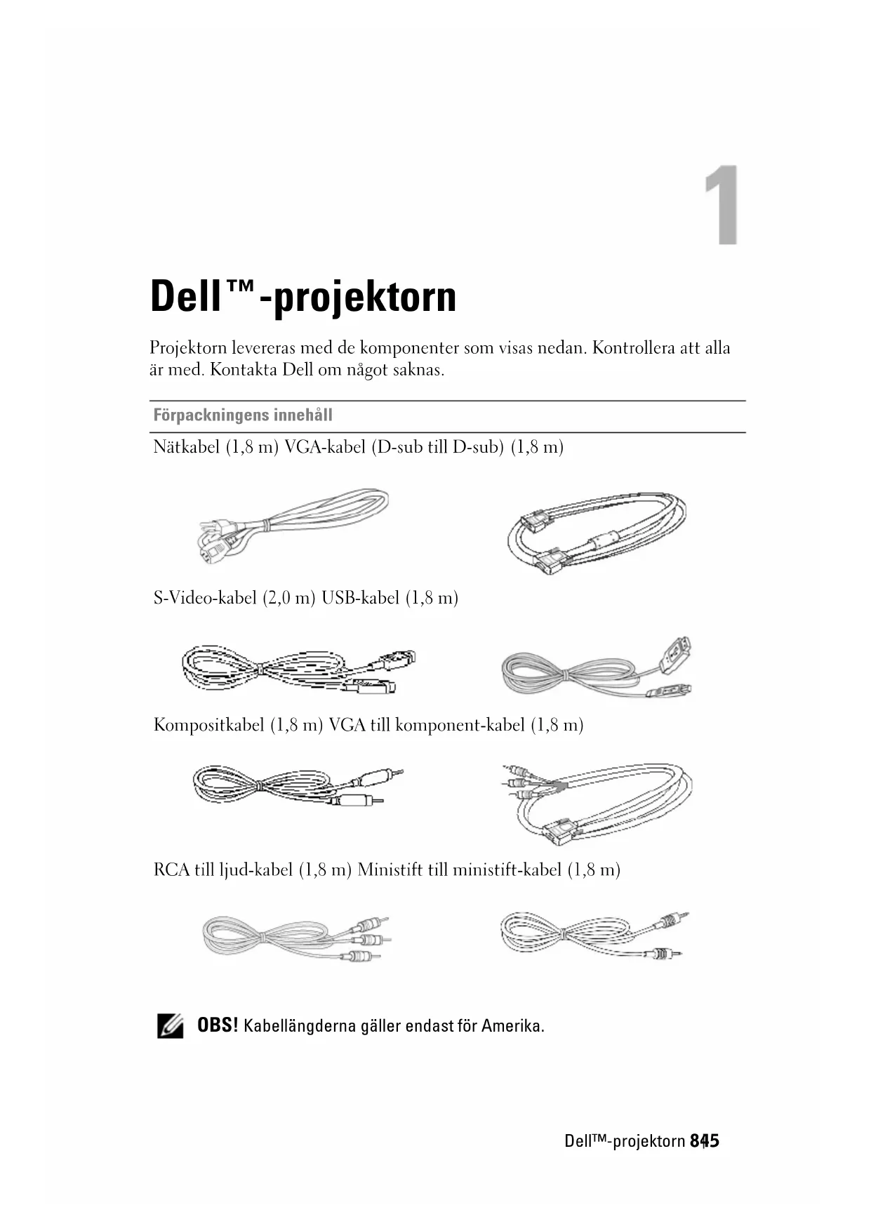 OBS! Kabellängderna gäller endast för Amerika.www.dell.com | support.dell.com 846 Dell™-projektorn Om projektorn Fjärrkontroll Batterier Bärväska Dokumentation 1 Kontrollpanel 2 Zoomspak 3 Fokusring 4 Lins 5 Höjdknapp 6 Fjärrkontrollsensor Förpackningens innehåll (fortsättning)