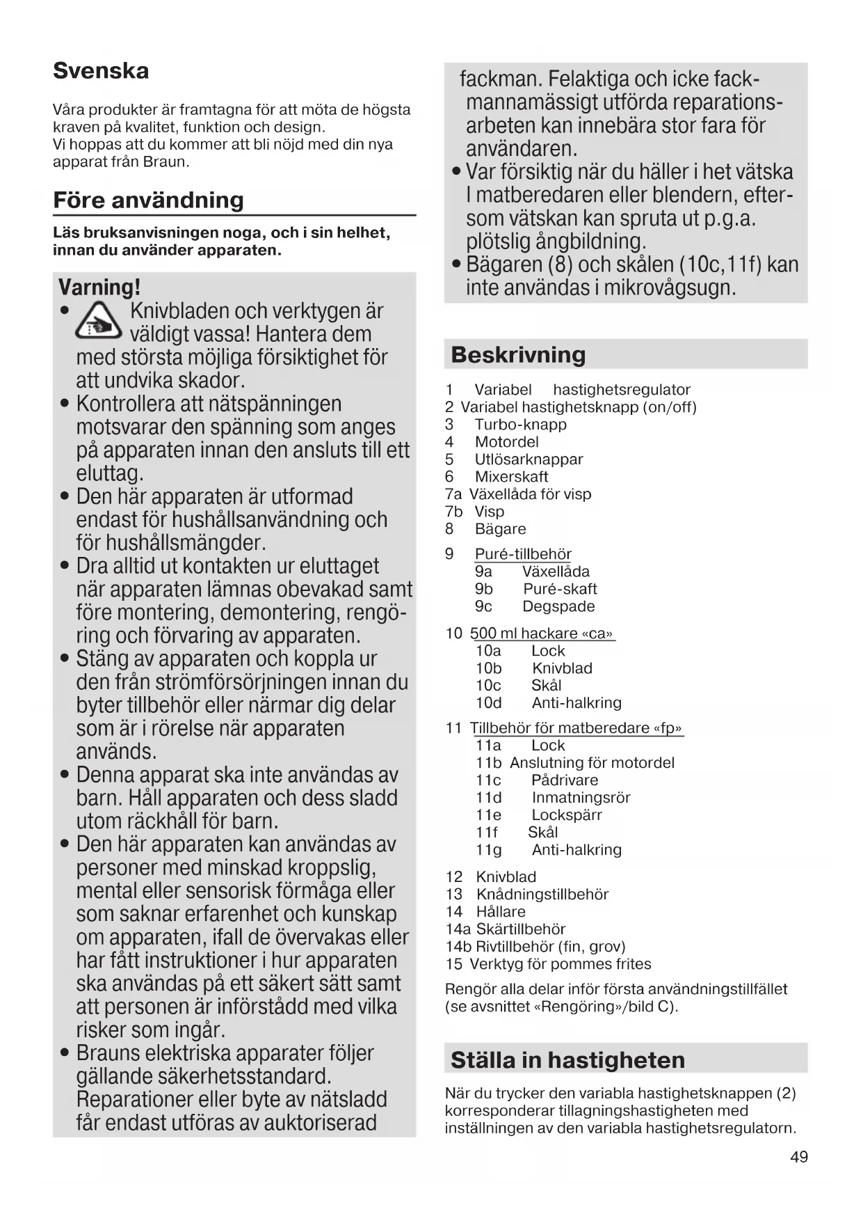 Brauns elektriska apparater följer gällande säkerhetsstandard. Reparationer eller byte av nätsladd får endast utföras av auktoriserad fackman. Felaktiga och icke fack- mannamässigt utförda reparations- arbeten kan innebära stor fara för användaren.