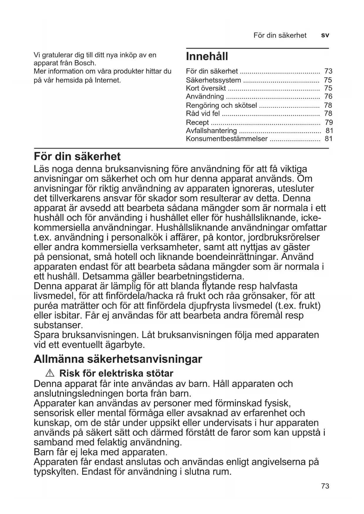 - För din säkerhet Läsnogadennabruksanvisningföreanvändningförattfåviktiga anvisningaromsäkerhetochomhurdennaapparatanvänds.Om anvisningarförriktiganvändningavapparatenignoreras,utesluter dettillverkarensansvarförskadorsomresulteraravdetta.Denna apparatäravseddattbearbetasådanamängdersomärnormalaiett hushållochföranvändingihushålletellerförhushållsliknande,icke- kommersiellaanvändningar.Hushållsliknandeanvändningaromfattar t.ex.användningipersonalkökiaffärer,påkontor,jordbruksrörelser ellerandrakommersiellaverksamheter,samtattnyttjasavgäster påpensionat,småhotellochliknandeboendeinrättningar.Använd apparatenendastförattbearbetasådanamängdersomärnormalai etthushåll.Detsammagällerbearbetningstiderna. Dennaapparatärlämpligförattblandaytanderesphalvfasta livsmedel,förattnfördela/hackaråfruktochråagrönsaker,föratt puréamaträtterochförattnfördeladjupfrystalivsmedel(t.ex.frukt) ellerisbitar.Fårejanvändasförattbearbetaandraföremålresp substanser. Sparabruksanvisningen.Låtbruksanvisningenföljamedapparaten videtteventuelltägarbyte. Allmänna säkerhetsanvisningar A Risk för elektriska stötar Dennaapparatfårinteanvändasavbarn.Hållapparatenoch anslutningsledningenbortafrånbarn. Apparaterkananvändasavpersonermedförminskadfysisk, sensoriskellermentalförmågaelleravsaknadaverfarenhetoch kunskap,omdestårunderuppsiktellerundervisatsihurapparaten användspåsäkertsättochdärmedförståttdefarorsomkanuppståi sambandmedfelaktiganvändning. Barnfårejlekamedapparaten. Apparatenfårendastanslutasochanvändasenligtangivelsernapå typskylten.Endastföranvändningislutnarum. Vigratulerardigtilldittnyainköpaven apparatfrånBosch. Merinformationomvåraprodukterhittardu påvårhemsidapåInternet. Innehåll Fördinsäkerhet p. 73