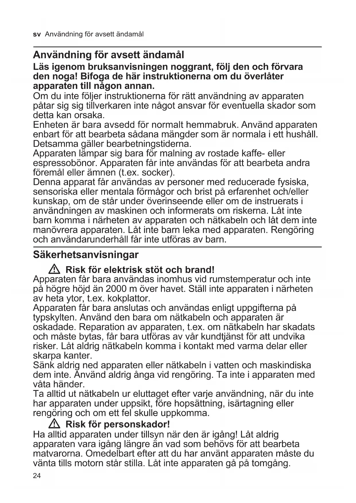 Vennligst kast innpakningsmaterialet på en miljø- og forskriftsmessig måte. Dette apparatet er klassifisert i henhold til det europeiske direk- tivet 2012/19/EU om avhending av elektrisk- og elektronisk utstyr (waste electrical and electronic equipment – WEEE). Direktivet angir rammene for innlevering og gjenvinning av innbytteprodukter. Faghandelen kan gi opplysninger om aktuelle avfallsmottak. Garanti For dette apparatet gjelder de garantibe- tingelser som er oppgitt av vår representant i de respektive land. Detaljer om disse garantibetingelsene får du ved å henvende deg til elektrohandelen der du har kjøpt apparatet. Ved krav i forbindelse med garantiytelser, er det i alle fall nødvendig å legge fram kvittering for kjøpet av apparatet. Det tas forbehold om endringer.24 sv Användning för avsett ändamål Användning för avsett ändamål Läs igenom bruksanvisningen noggrant, följ den och förvara den noga! Bifoga de här instruktionerna om du överlåter apparaten till någon annan. Om du inte följer instruktionerna för rätt användning av apparaten påtar sig sig tillverkaren inte något ansvar för eventuella skador som detta kan orsaka. Enheten är bara avsedd för normalt hemmabruk. Använd apparaten enbart för att bearbeta sådana mängder som är normala i ett hushåll. Detsamma gäller bearbetningstiderna. Apparaten lämpar sig bara för malning av rostade kaffe- eller espressobönor. Apparaten får inte användas för att bearbeta andra föremål eller ämnen (t.ex. socker). Denna apparat får användas av personer med reducerade fysiska, sensoriska eller mentala förmågor och brist på erfarenhet och/eller kunskap, om de står under överinseende eller om de instruerats i användningen av maskinen och informerats om riskerna. Låt inte barn komma i närheten av apparaten och nätkabeln och låt dem inte manövrera apparaten. Låt inte barn leka med apparaten. Rengöring och användarunderhåll får inte utföras av barn. Säkerhetsanvisningar W Risk för elektrisk stöt och brand! Apparaten får bara användas inomhus vid rumstemperatur och inte på högre höjd än 2000 m över havet. Ställ inte apparaten i närheten av heta ytor, t.ex. kokplattor. Apparaten får bara anslutas och användas enligt uppgifterna på typskylten. Använd den bara om nätkabeln och apparaten är oskadade. Reparation av apparaten, t.ex. om nätkabeln har skadats och måste bytas, får bara utföras av vår kundtjänst för att undvika risker. Låt aldrig nätkabeln komma i kontakt med varma delar eller skarpa kanter. Sänk aldrig ned apparaten eller nätkabeln i vatten och maskindiska dem inte. Använd aldrig ånga vid rengöring. Ta inte i apparaten med våta händer. Ta alltid ut nätkabeln ur eluttaget efter varje användning, när du inte har apparaten under uppsikt, före hopsättning, isärtagning eller rengöring och om ett fel skulle uppkomma. W Risk för personskador! Ha alltid apparaten under tillsyn när den är igång! Låt aldrig apparaten vara igång längre än vad som behövs för att bearbeta matvarorna. Omedelbart efter att du har använt apparaten måste du vänta tills motorn står stilla. Låt inte apparaten gå på tomgång.25