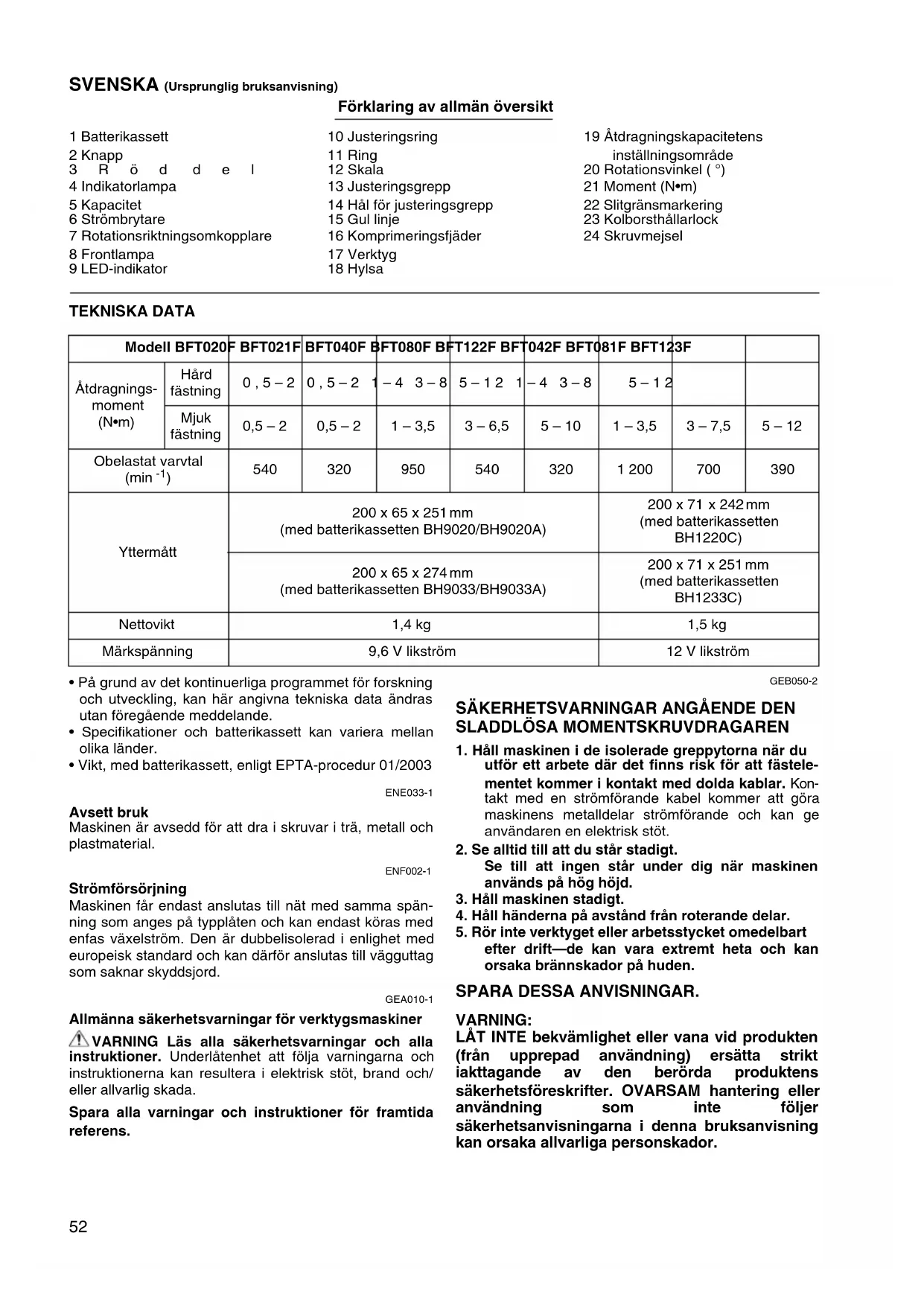 - Vikt, med batterikassett, enligt EPTA-procedur 01/2003 ENE033-1 Avsett bruk Maskinen är avsedd för att dra i skruvar i trä, metall och plastmaterial. ENF002-1 Strömförsörjning Maskinen får endast anslutas till nät med samma spän- ning som anges på typplåten och kan endast köras med enfas växelström. Den är dubbelisolerad i enlighet med europeisk standard och kan därför anslutas till vägguttag som saknar skyddsjord. GEA010-1 Allmänna säkerhetsvarningar för verktygsmaskiner VARNING Läs alla säkerhetsvarningar och alla instruktioner. Underlåtenhet att följa varningarna och instruktionerna kan resultera i elektrisk stöt, brand och/ eller allvarlig skada. Spara alla varningar och instruktioner för framtida referens. GEB050-2