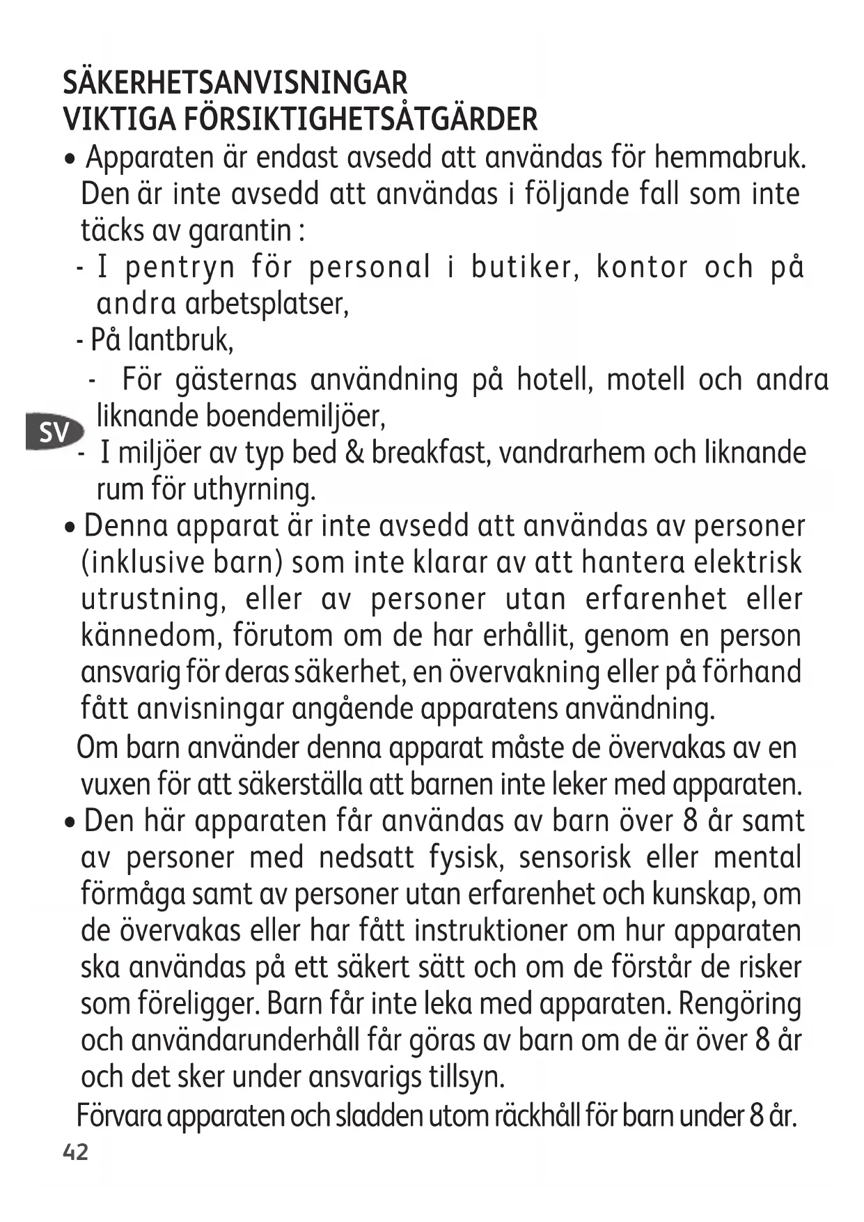 - Den här apparaten får användas av barn över 8 år samt av personer med nedsatt fysisk, sensorisk eller mental förmåga samt av personer utan erfarenhet och kunskap, om de övervakas eller har fått instruktioner om hur apparaten ska användas på ett säkert sätt och om de förstår de risker som föreligger. Barn får inte leka med apparaten. Rengöring och användarunderhåll får göras av barn om de är över 8 år och det sker under ansvarigs tillsyn. Förvara apparaten och sladden utom räckhåll för barn under 8 år. SV43