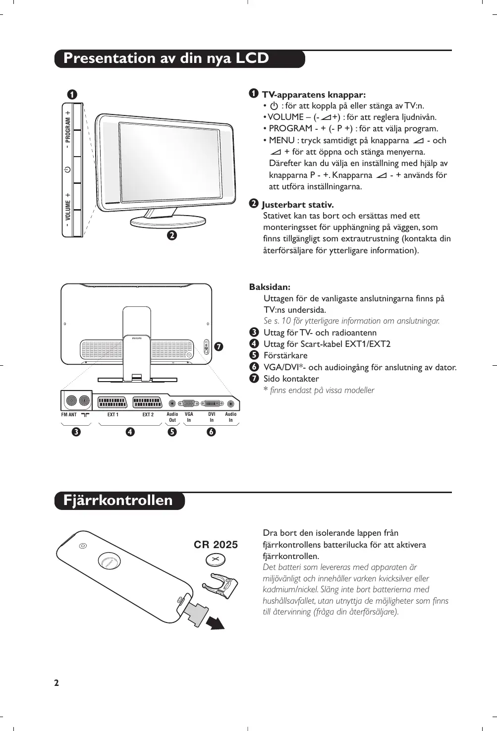 Dra bort den isolerande lappen från fjärrkontrollens batterilucka för att aktivera fjärrkontrollen. Det batteri som levereras med apparaten är miljövänligt och innehåller varken kvicksilver eller kadmium/nickel. Släng inte bort batterierna med hushållsavfallet, utan utnyttja de möjligheter som finns till återvinning (fråga din återförsäljare). Knappar på fjärrkontrollen Ljudlägen Gör det möjligt att koppla om sändningar i Stereo och Nicam Stereo till Mono eller, vid tvåspråkiga sändningar, att välja mellan Dual I och Dual II. Mono-läge visas indikeringen i rött. Beredskapsläge För att gå till beredskapsläge. Koppla på TV-apparaten igen genom att trycka på ., P - + eller ñ/ô. Val av läge * Pixel + (beroende på version) För att starta / stoppa Pixel + demonstrationsläge. Val av EXT-uttag (sid.10) Tryck flera gånger för att välja inkopplad apparattyp. Surroundljud För att aktivera / stänga av ljudbreddningseffekten. I stereoläge får man intryck av att avståndet mellan högtalarna är större. Med de modeller som är utrustade med Virtual Dolby Surround*, får man Dolby Surround Pro Logic —systemets bakre ljudeffekter. 16:9-format (sid. 7) Aktivera PIP-funktionen (s. 8) PC/TV/Radio Tryck på en av dessa knappar för att växla mellan PC,TV, eller radioläge (s. 9). Active Control: Optimerar automatiskt apparatens inställningar för att passa den mottagna signalen och det omgivande ljusförhållandena. Markör (<>≤≥) Med hjälp av de här 4 knapparna kan du flytta i menyerna. Meny För att visa eller lämna menyerna. Tyst För att koppla bort eller koppla tillbaka ljudet. Volym För att justera ljudnivån. Bild- och ljudinställningar För en serie bild- och ljudinställningar: Läget Personlig motsvaras av de inställningar man gjort i menyerna. Skärminformation För att visa/ta bort programmets nummer, klockslag, ljudläge och timerns återstående tid. Håll knappen nedtryckt i 5 sekunder för att programnummer ska visas permanent på skärmen. Visning av text-TV (sid. 8) Förteckning över kanalerna Visa / dölja förteckningen över kanalerna.Använd sedan knapparna <> för att välja en kanal och knappen ≥ för att visa den.