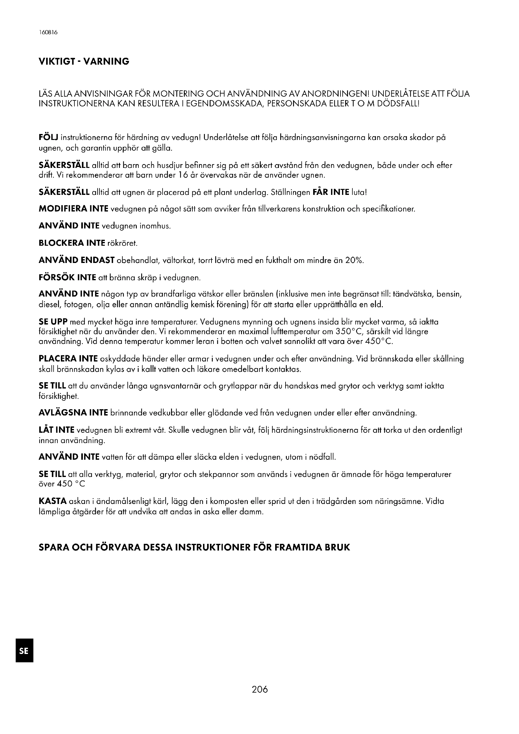 LÄS ALLA ANVISNINGAR FÖR MONTERING OCH ANVÄNDNING AV ANORDNINGEN! UNDERLÅTELSE ATT FÖLJA INSTRUKTIONERNA KAN RESULTERA I EGENDOMSSKADA, PERSONSKADA ELLER T O M DÖDSFALL! FÖLJ instruktionerna för härdning av vedugn! Underlåtelse att följa härdningsanvisningarna kan orsaka skador på ugnen, och garantin upphör att gälla SÄKERSTÄLL alltid att barn och husdjur befinner sig på ett säkert avstånd från den vedugnen, både under och efter drift Vi rekommenderar att barn under 16 år övervakas när de använder ugnen SÄKERSTÄLL alltid att ugnen är placerad på ett plant underlag Ställningen FÅR INTE luta! MODIFIERA INTE vedugnen på något sätt som avviker från tillverkarens konstruktion och specifikationer ANVÄND INTE vedugnen inomhus BLOCKERA INTE rökröret ANVÄND ENDAST obehandlat, vältorkat, torrt lövträ med en fukthalt om mindre än 20% FÖRSÖK INTE att bränna skräp i vedugnen ANVÄND INTE någon typ av brandfarliga vätskor eller bränslen (inklusive men inte begränsat till: tändvätska, bensin, diesel, fotogen, olja eller annan antändlig kemisk förening) för att starta eller upprätthålla en eld SE UPP med mycket höga inre temperaturer Vedugnens mynning och ugnens insida blir mycket varma, så iaktta försiktighet när du använder den Vi rekommenderar en maximal lufttemperatur om 350°C, särskilt vid längre användning Vid denna temperatur kommer leran i botten och valvet sannolikt att vara över 450°C PLACERA INTE oskyddade händer eller armar i vedugnen under och efter användning Vid brännskada eller skållning skall brännskadan kylas av i kallt vatten och läkare omedelbart kontaktas SE TILL att du använder långa ugnsvantarnär och grytlappar när du handskas med grytor och verktyg samt iaktta försiktighet AVLÄGSNA INTE brinnande vedkubbar eller glödande ved från vedugnen under eller efter användning LÅT INTE vedugnen bli extremt våt Skulle vedugnen blir våt, följ härdningsinstruktionerna för att torka ut den ordentligt innan användning ANVÄND INTE vatten för att dämpa eller släcka elden i vedugnen, utom i nödfall SE TILL att alla verktyg, material, grytor och stekpannor som används i vedugnen är ämnade för höga temperaturer över 450 °C KASTA askan i ändamålsenligt kärl, lägg den i komposten eller sprid ut den i trädgården som näringsämne Vidta lämpliga åtgärder för att undvika att andas in aska eller damm SPARA OCH FÖRVARA DESSA INSTRUKTIONER FÖR FRAMTIDA BRUK 160816SE