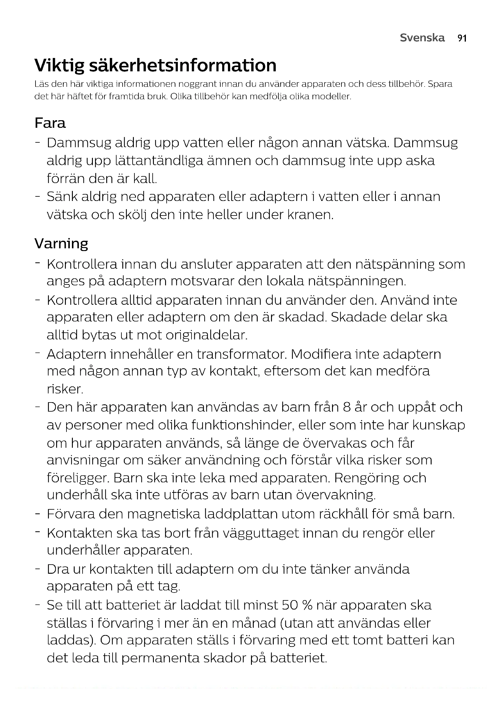 SuomiSvenska Viktig säkerhetsinformation Läs den här viktiga informationen noggrant innan du använder apparaten och dess tillbehör. Sparadet här häftet för framtida bruk. Olika tillbehör kan medfölja olika modeller. Fara