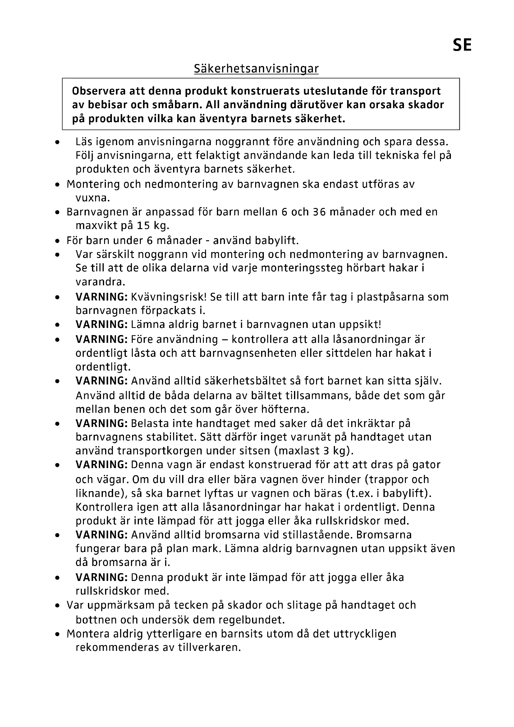 Läs igenom anvisningarna noggrannt före användning och spara dessa. Följ anvisningarna, ett felaktigt användande kan leda till tekniska fel på produkten och äventyra barnets säkerhet. Montering och nedmontering av barnvagnen ska endast utföras av vuxna. Barnvagnen är anpassad för barn mellan 6 och 36 månader och med en maxvikt på 15 kg. För barn under 6 månader - använd babylift. Var särskilt noggrann vid montering och nedmontering av barnvagnen. Se till att de olika delarna vid varje monteringssteg hörbart hakar i varandra. VARNING: Kvävningsrisk! Se till att barn inte får tag i plastpåsarna som barnvagnen förpackats i. VARNING: Lämna aldrig barnet i barnvagnen utan uppsikt! VARNING: Före användning – kontrollera att alla låsanordningar är ordentligt låsta och att barnvagnsenheten eller sittdelen har hakat i ordentligt. VARNING: Använd alltid säkerhetsbältet så fort barnet kan sitta själv. Använd alltid de båda delarna av bältet tillsammans, både det som går mellan benen och det som går över höfterna. VARNING: Belasta inte handtaget med saker då det inkräktar på barnvagnens stabilitet. Sätt därför inget varunät på handtaget utan använd transportkorgen under sitsen (maxlast 3 kg). VARNING: Denna vagn är endast konstruerad för att att dras på gator och vägar. Om du vill dra eller bära vagnen över hinder (trappor och liknande), så ska barnet lyftas ur vagnen och bäras (t.ex. i babylift). Kontrollera igen att alla låsanordningar har hakat i ordentligt. Denna produkt är inte lämpad för att jogga eller åka rullskridskor med. VARNING: Använd alltid bromsarna vid stillastående. Bromsarna fungerar bara på plan mark. Lämna aldrig barnvagnen utan uppsikt även då bromsarna är i. VARNING: Denna produkt är inte lämpad för att jogga eller åka rullskridskor med. Var uppmärksam på tecken på skador och slitage på handtaget och bottnen och undersök dem regelbundet. Montera aldrig ytterligare en barnsits utom då det uttryckligen rekommenderas av tillverkaren. Observera att denna produkt konstruerats uteslutande för transport av bebisar och småbarn. All användning därutöver kan orsaka skador på produkten vilka kan äventyra barnets säkerhet. SE Om barnvagnen körs i trappor eller avsatser eller om den lyfts eller bärs ska barnet tas ur vagnen. Vad gäller tillåten belastning av barnvagnen, beakta tillverkarens anvisningar eller kontakta en fackbutik. Spara denna bruksanvisning under barnvagnens hela användningstid och skulle barnvagnen ges vidare till någon annan - bifoga också bruksanvisningen. Använd enbart orginalreservdelar och tillbehör som uttryckligen rekommenderas av tillverkaren. Om barnvagnen är utrustad med en extra broms ska denna alltid ställas in så att hjulet som bromsas inte kan blockeras. Kontrollera regelbundet lufttrycket om barnvagnen är utrustad med luftfyllda däck! (ANVISNING: Tryck lätt med tummen på däcket). Det maximalt rekommenderade lufttrycket anges på däcken. OBSERVERA: Luftfyllda däck kan orsaka permanenta fläckar på laminat- parkett- eller plastgolv! Skötsel och underhåll av barnvagnen: Vänligen följ de medföljande skötselråden för de avtagbara och tvättbara textilierna som vagnen är utrustad med. Använd inga starka eller slitande rengöringsmedel utan bara såpvatten eller ett speciellt textilrengöringsmedel. Plastdelarna och underredet rengöres också med såpvatten. Efter att barnvagnen använts i regn och väta ska underredet alltid rengöras och torkas. Om textilöverdragen blivit blöta ska barnvagnen få torka i uppfällt läge. Hjulen ska regelbundet tas av och hjulaxlarna liksom alla länkar och fjädringen smörjas med en syrafri olja (symaskinsolja, WD40 eller fettfritt glidmedel). Därmed kommer barnvagnen att rulla lätt och tyst och förtida förslitningsskador förebyggas. Förhindra att rost uppkommer genom att vårda barnvagnen väl, då rost inte utgör grund för reklamation. OBSERVERA: Ingående material är ofta polyester- respektive bomullsblandningar vilka uppfyller gällande normer. Vid starka påfrestningar under längre tid (t.ex. intensiv solinstrålning) kan naturmaterial förlora färgen, vilket inte utgör grund för reklamation. Viktig hänvisning: Avsedd för ett barn som väger maximalt ca. 15kg. Läs bruksanvisningen och bevara den. Spara även kvittot! Vi förbehåller oss rätten för än- dringar av leveransstorlek, tekniska förändringar samt kundspecifika avvikningar! Produktens färger och utrustning kan avvika från den visade bilden. Enligt EN-1888 / 01.05.2012 Av 10.12.2012 SEUppställning: Öppna säkerhetslåset (Bild. 1a). Dra det skjutbara handtaget rakt uppåt, så att barnvagnen står helt uppställd (Bild 1b). Ihopsättande / Avtagande av bakaxeln: Ihopsättande: Fäst bakaxeln på chassit (Bild 2a). Avtagande: Tryck på de båda säkerhetsstiften av metall på insidan (Bild 2b) och dra bakaxeln från chassit. Ihopsättande / Avtagande av bakre hjulen: Ihopsättande av bakhjulen: Sätt på hjulet på axeln (Bild 3a). Avtagande av bakhjulen: Tryck på uppreglingsknappen (Bild 3b) i mitten av hjulet och dra hjulet från axeln. Ihopsättande / Avtagande av framhjulen: Ihopsättande av framhjulen: Tryck fast framhjulet på hjulupphängningen vid chassit (Bild 4a). Avtagande av framhjulen: Tryck på båda säkerhetsknapparna vid undersidan av hjulupphängningen (Bild 4b) och dra av hjulet. Svängbarhetsfunktion: Låsa upp hjulen: Dra den svarta spaken vid framhjulsmontaget inåt (Bild 5a). Låsning av hjulen: Dra den svarta spaken utåt (Bild 5b). Reglering av sittposition: För att ta isär sittdelen, tryck på båda tryckknapparna på utsidan (Bild 6a). Du kan också fixera sittdelen mitt emot färdriktningen (Bild 6b). Genom att dra lätt uppåt kan du pröva om sittdelen är ordentligt ihakad. Genom att använda tryckknapparna kan du ställa in sittdelen i sittposition (Bild 6c) eller i liggposition (Bild 6d