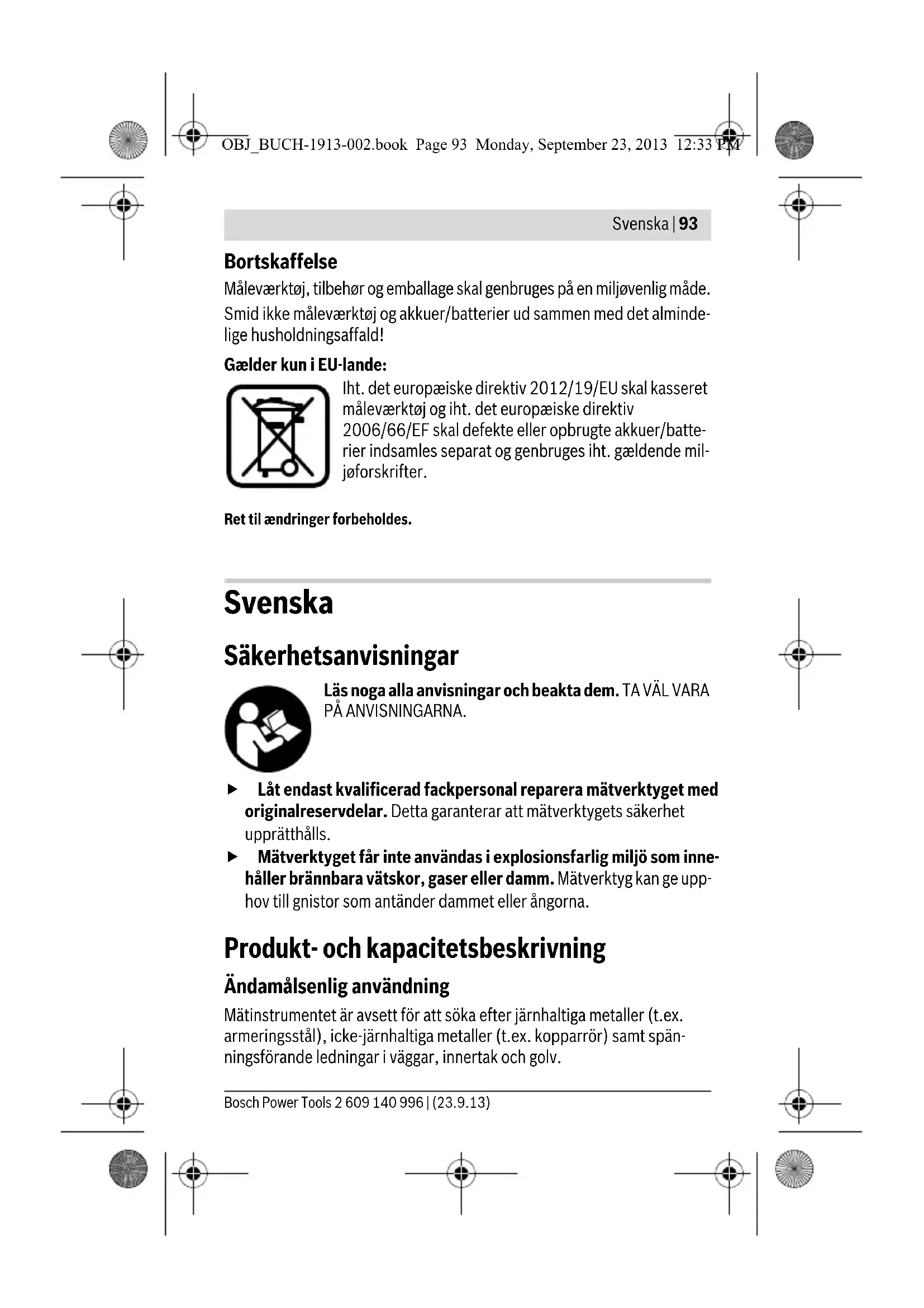 - Vær derfor også opmærksom på andre informationskilder (f.eks. bygningstegnin- ger), før du borer, saver eller fræser i vægge, lofter eller gulve. Årsag Afhjælpning OBJ_BUCH-1913-002.book Page 92 Monday, September 23, 2013 12:33 PMSvenska | 93 Bosch Power Tools 2 609 140 996 | (23.9.13) Bortskaffelse Måleværktøj, tilbehør og emballage skal genbruges på en miljøvenlig måde. Smid ikke måleværktøj og akkuer/batterier ud sammen med det alminde- lige husholdningsaffald! Gælder kun i EU-lande: Iht. det europæiske direktiv 2012/19/EU skal kasseret måleværktøj og iht. det europæiske direktiv 2006/66/EF skal defekte eller opbrugte akkuer/batte- rier indsamles separat og genbruges iht. gældende mil- jøforskrifter. Ret til ændringer forbeholdes. Svenska Säkerhetsanvisningar Läs noga alla anvisningar och beakta dem. TA VÄL VARA PÅ ANVISNINGARNA. Låt endast kvalificerad fackpersonal reparera mätverktyget med originalreservdelar. Detta garanterar att mätverktygets säkerhet upprätthålls. Mätverktyget får inte användas i explosionsfarlig miljö som inne- håller brännbara vätskor, gaser eller damm. Mätverktyg kan ge upp- hov till gnistor som antänder dammet eller ångorna. Produkt- och kapacitetsbeskrivning Ändamålsenlig användning Mätinstrumentet är avsett för att söka efter järnhaltiga metaller (t.ex. armeringsstål), icke-järnhaltiga metaller (t.ex. kopparrör) samt spän- ningsförande ledningar i väggar, innertak och golv. OBJ_BUCH-1913-002.book Page 93 Monday, September 23, 2013 12:33 PM94 | Svenska 2 609 140 996 | (23.9.13) Bosch Power Tools Illustrerade komponenter Numreringen av komponenterna hänvisar till illustration av mätverktyget på grafiksidan. 1 Märkdon 2 Signallampa 3 Strömställare Till/Från 4 Spärr på batterifackets lock 5 Batterifackets lock 6 Sensorområde Tekniska data Digital detektor PMD 7 Produktnummer 3 603 F81 100 max. detekteringsdjup*: –Järn – Icke-järnmetall (kopparrör) – Kopparledningar (spänningsförande)** 70 mm 60 mm 50 mm Kalibrering automatisk Automatisk frånkoppling efter ca 10 min Driftstemperatur 0°C...+40°C Lagringstemperatur –20 °C...+70 °C Relativ luftfuktighet max. 80 % Batterier 3x1,5V AAA Drifttid (alkali-mangan-batterier) ca.