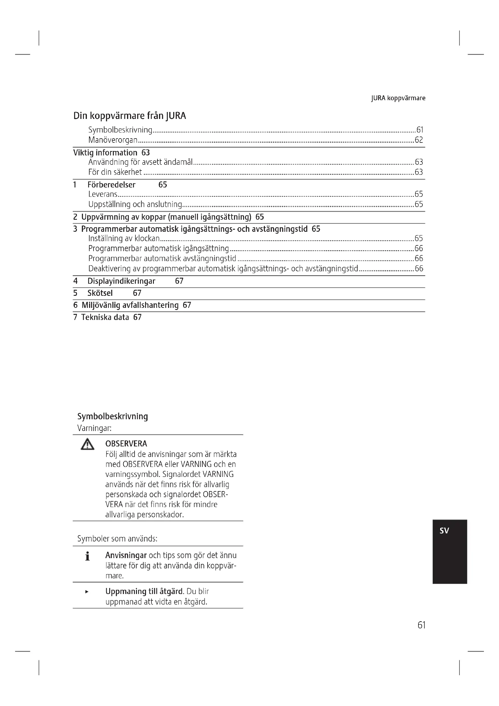 Manöverorgan63 JURA koppvärmare Viktig information Användning för avsett ändamål Apparaten är utformad och konstru- erad för privat hushållsbruk. Appara- ten är endast avsedd för placering och uppvärmning av koppar i de utdragbara lådorna. All annan användning är inte ändamålsenlig. JURA Elektroapparate AG påtar sig inget ansvar för följderna om apparaten används för något annat ändamål än det avsedda. Läs igenom hela denna bruksanvis- ning innan du använder apparaten och följ anvisningarna. Ha bruksan- visningen tillgänglig nära apparaten och lämna över den till eventuella framtida användare. För din säkerhet Läs och observera noggrant de följande viktiga säkerhetsföreskrif- terna. Så här gör du för att inte utsätta dig för livsfara genom elektrisk stöt: Z Använd endast originalnätkabeln från JURA som ingår i leveransen. Z Använd aldrig apparaten om den är skadad eller om nätsladden är trasig. Z Använd aldrig apparaten om du är våt om händerna. Z Se till att nätsladden är torr innan du tar apparaten i drift. Z Använd endast nätsladden som ingår i leveransen för att ansluta apparaten till växelströmsnätet. Z Om du misstänker att apparaten är skadad, till exempel om den luktar bränt, ska du omedelbart dra ut nätsladden och kontakta JURAs service. Z Var noga med att inte placera apparaten eller nätsladden i närheten av varma ytor eller öppen eld. Z Se till att nätsladden inte kläms eller skaver mot vassa kanter. Z Försök aldrig själv öppna och laga apparaten. Gör inga änd- ringar på apparaten som inte finns beskrivna i bruksanvis- ningen. Apparaten innehåller strömförande delar. En skadad apparat är inte säker och kan orsaka personskador och brand. Gör så här för att undvika skador på apparaten vilka innebär risk för brand och personskador: Z Låt aldrig nätsladden hänga löst. Man kan snubbla på nätsladden, eller så kan den bli skadad. Z Skydda apparaten mot regn, frost och direkt solljus etc. Z Apparaten får inte användas för förvaring och uppvärmning av drycker eller andra livsmedel.