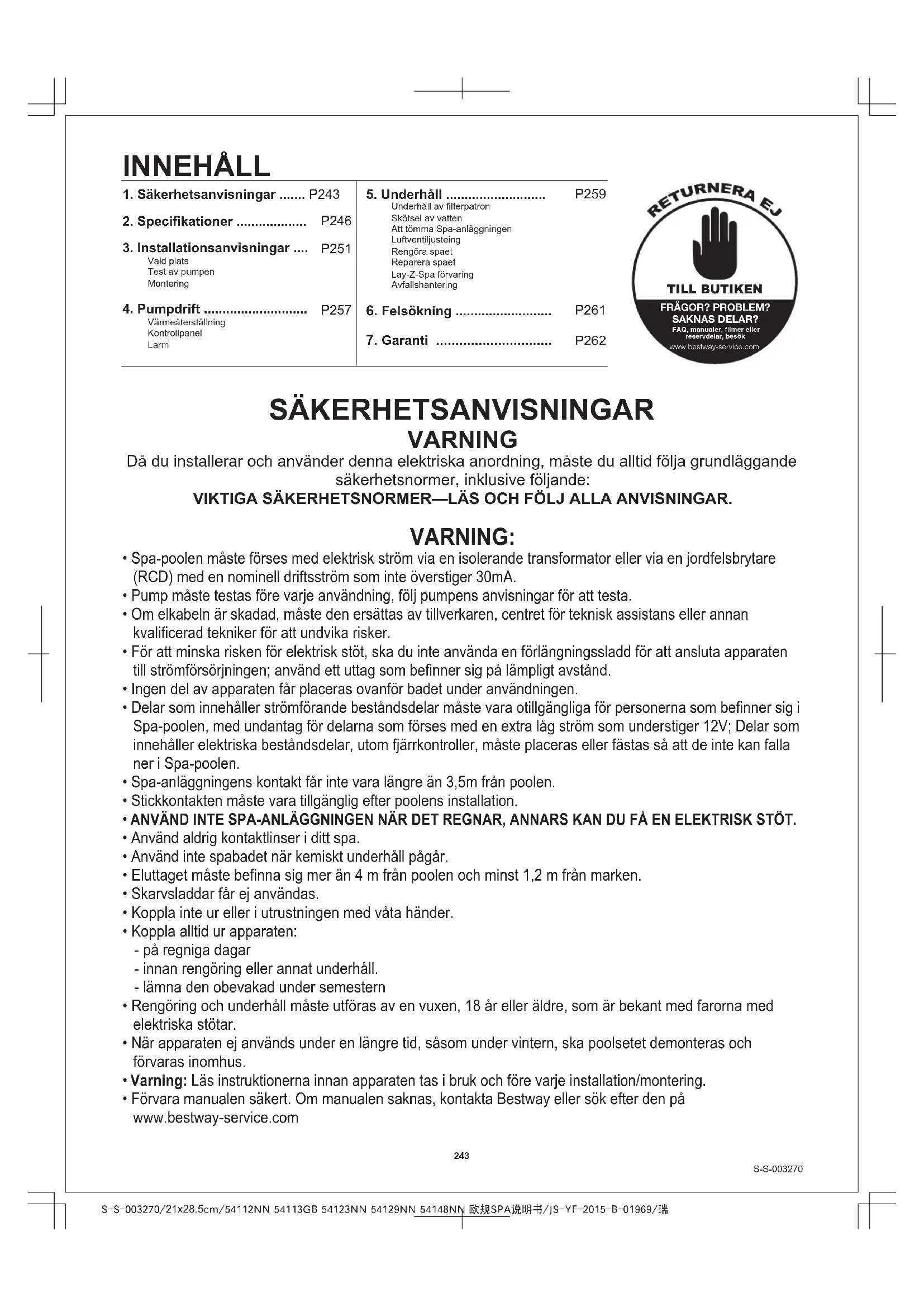 - Produkten är inte avsedd för kommersiellt bruk. SPAR DENNA BRUKSANVISNINGS-S-003270/21x28.5cm/54112NN 54113GB 54123NN 54129NN 54148NN 欧规SPA说明书/JS-YF-2015-B-01969/瑞 VARNING: