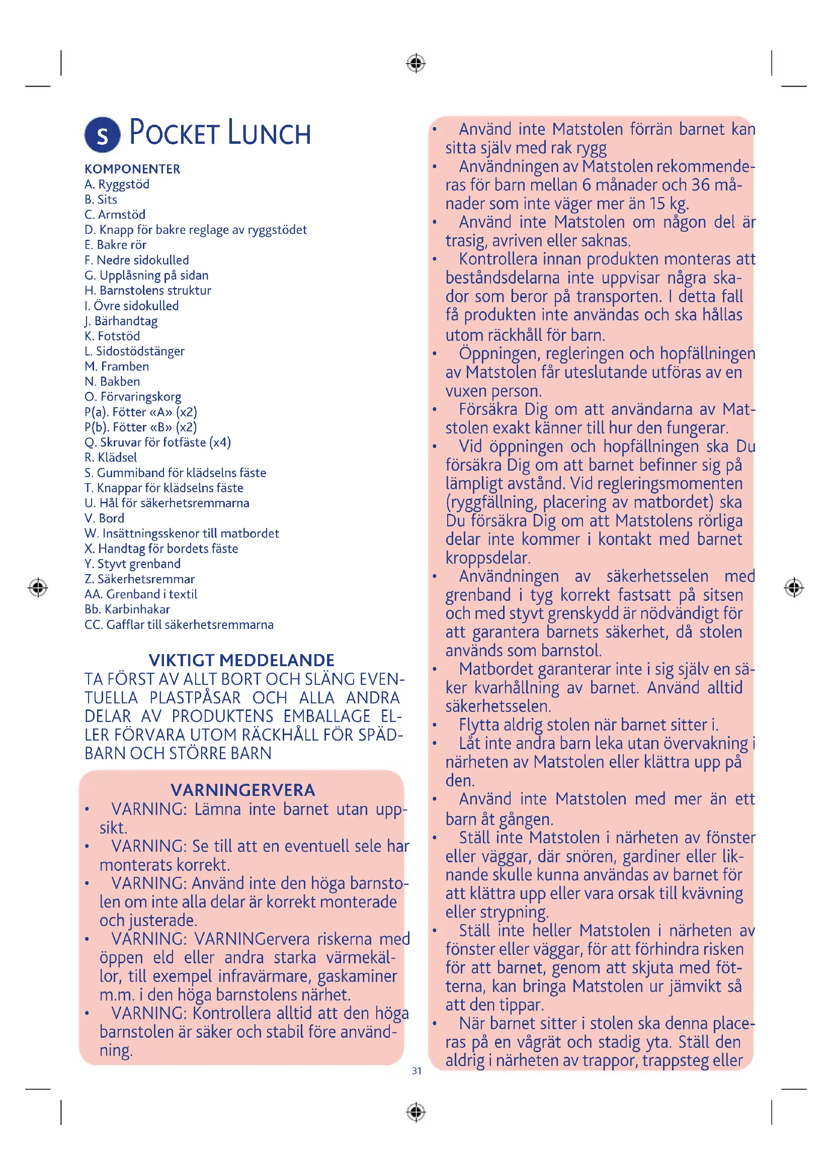 - VARNING: Kontrollera alltid att den höga barnstolen är säker och stabil före använd- ning.