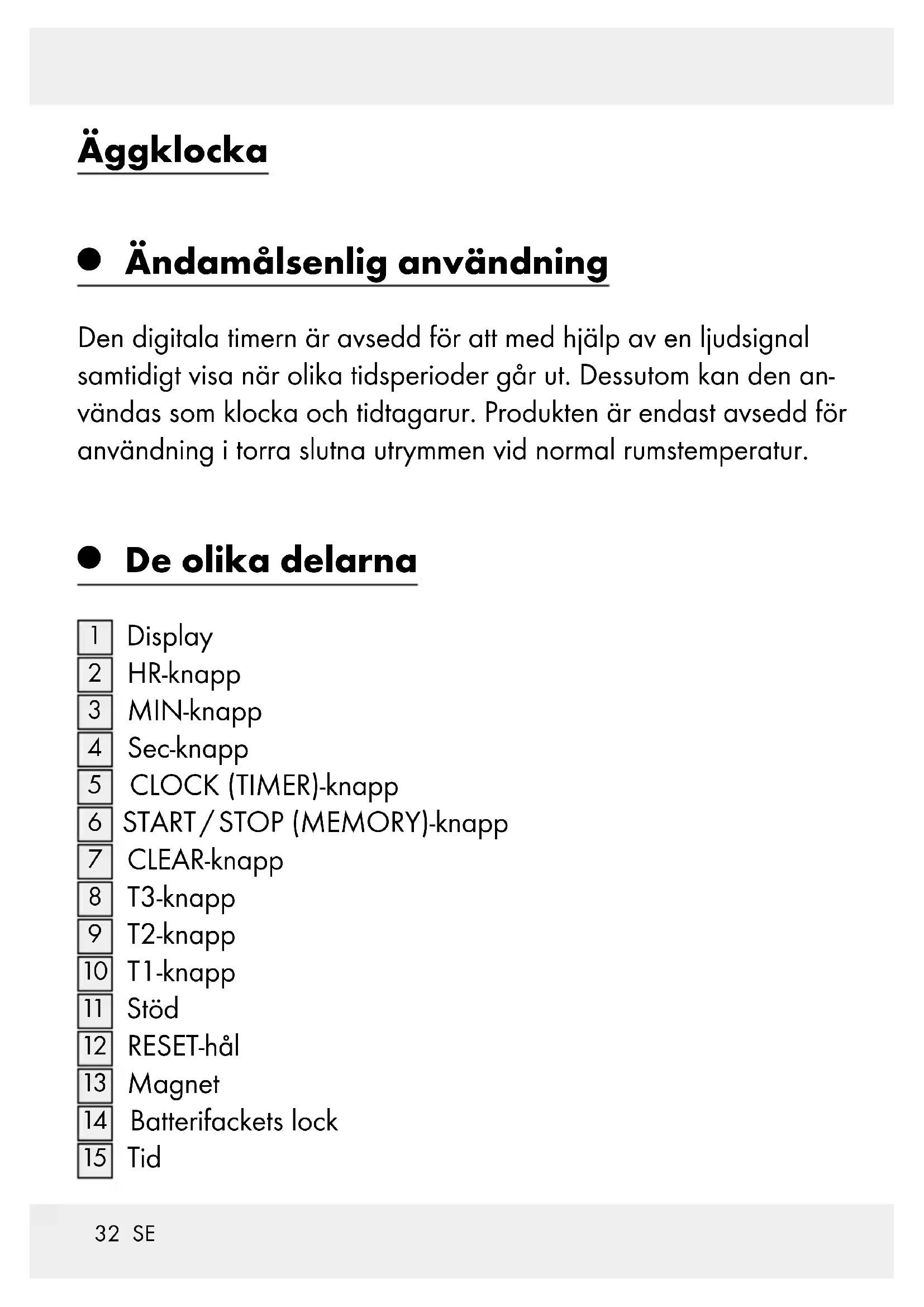 Ändamålsenlig användning Den digitala timern är avsedd för att med hjälp av en ljudsignal samtidigt visa när olika tidsperioder går ut. Dessutom kan den an- vändas som klocka och tidtagarur. Produkten är endast avsedd för användning i torra slutna utrymmen vid normal rumstemperatur.