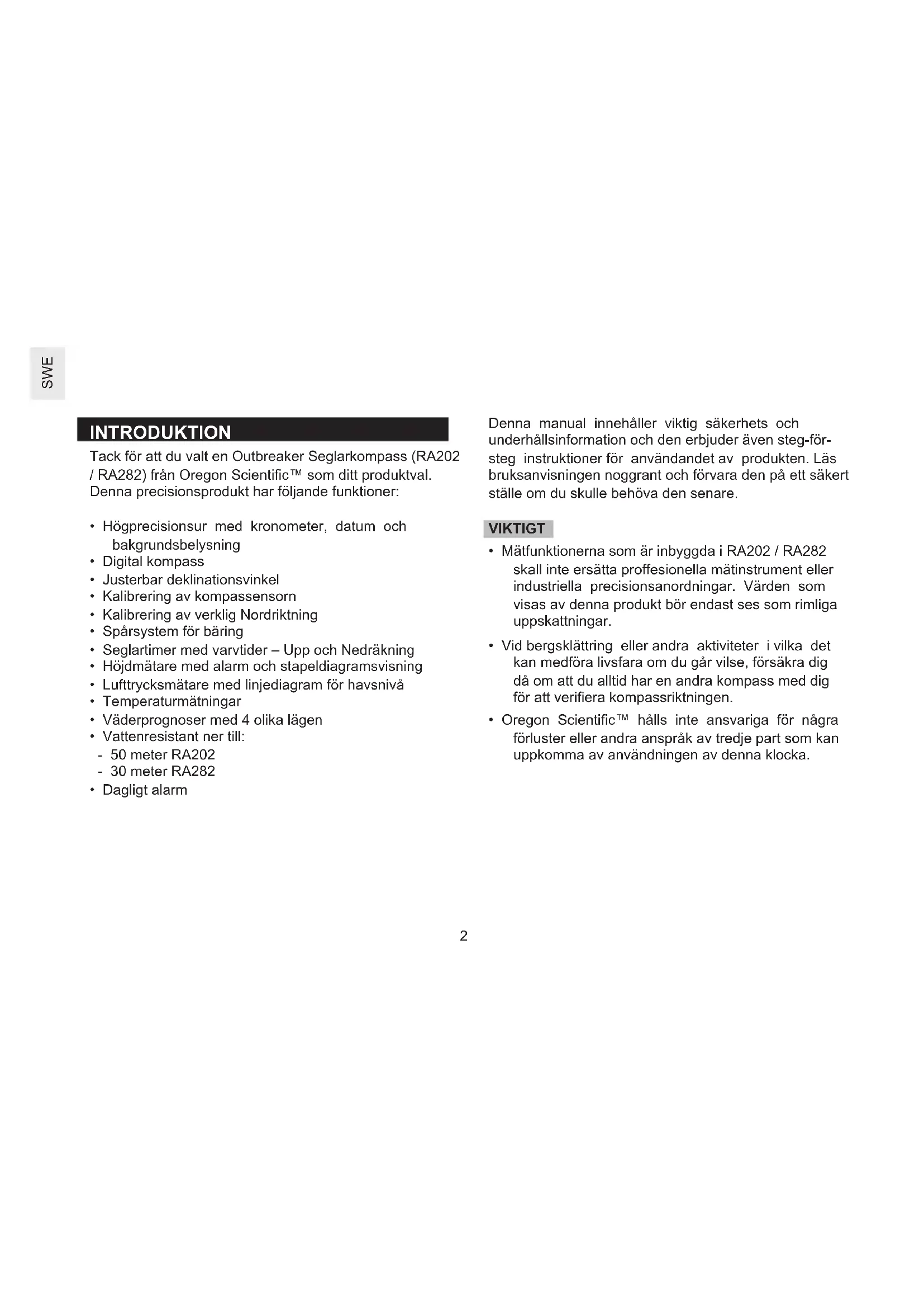 Outbreaker Seglarkompass Modell: RA202 / RA282 Användarmanual RA202_M_SWE.indd 1 10/19/07 11:39:04 AM2 SWE INTRODUKTION Tack för att du valt en Outbreaker Seglarkompass (RA202 / RA282) från Oregon Scientific™ som ditt produktval. Denna precisionsprodukt har följande funktioner: