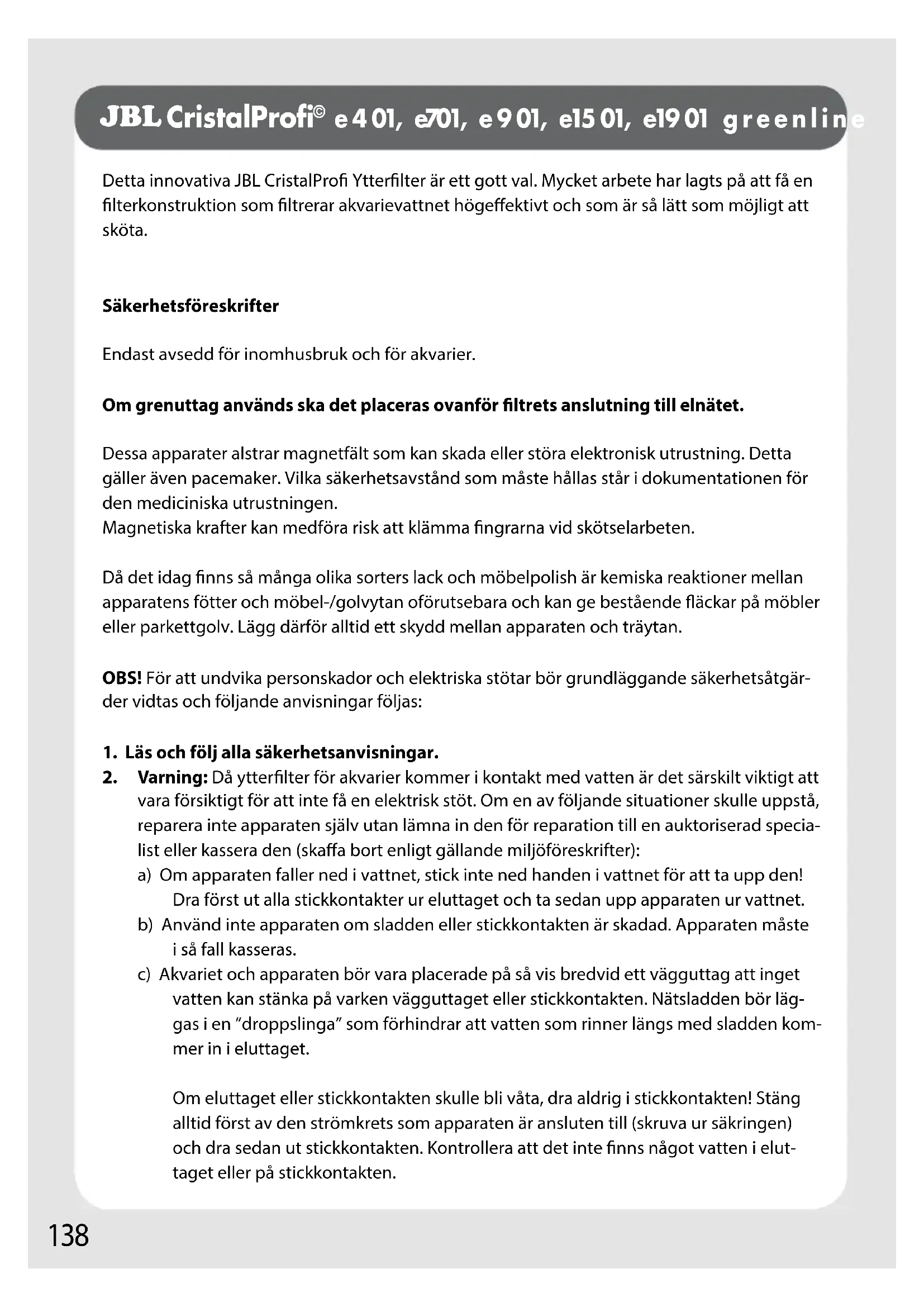 e 4 01, e701, e 9 01, e15 01, e19 01 g r e e n l i n e Detta innovativa JBL CristalPro Ytterlter är ett gott val. Mycket arbete har lagts på att få en lterkonstruktion som ltrerar akvarievattnet högeektivt och som är så lätt som möjligt att sköta. Säkerhetsföreskrifter Endast avsedd för inomhusbruk och för akvarier. Om grenuttag används ska det placeras ovanför ltrets anslutning till elnätet. Dessa apparater alstrar magnetfält som kan skada eller störa elektronisk utrustning. Detta gäller även pacemaker. Vilka säkerhetsavstånd som måste hållas står i dokumentationen för den mediciniska utrustningen. Magnetiska krafter kan medföra risk att klämma ngrarna vid skötselarbeten. Då det idag nns så många olika sorters lack och möbelpolish är kemiska reaktioner mellan apparatens fötter och möbel-/golvytan oförutsebara och kan ge bestående äckar på möbler eller parkettgolv. Lägg därför alltid ett skydd mellan apparaten och träytan. OBS! För att undvika personskador och elektriska stötar bör grundläggande säkerhetsåtgär- der vidtas och följande anvisningar följas: