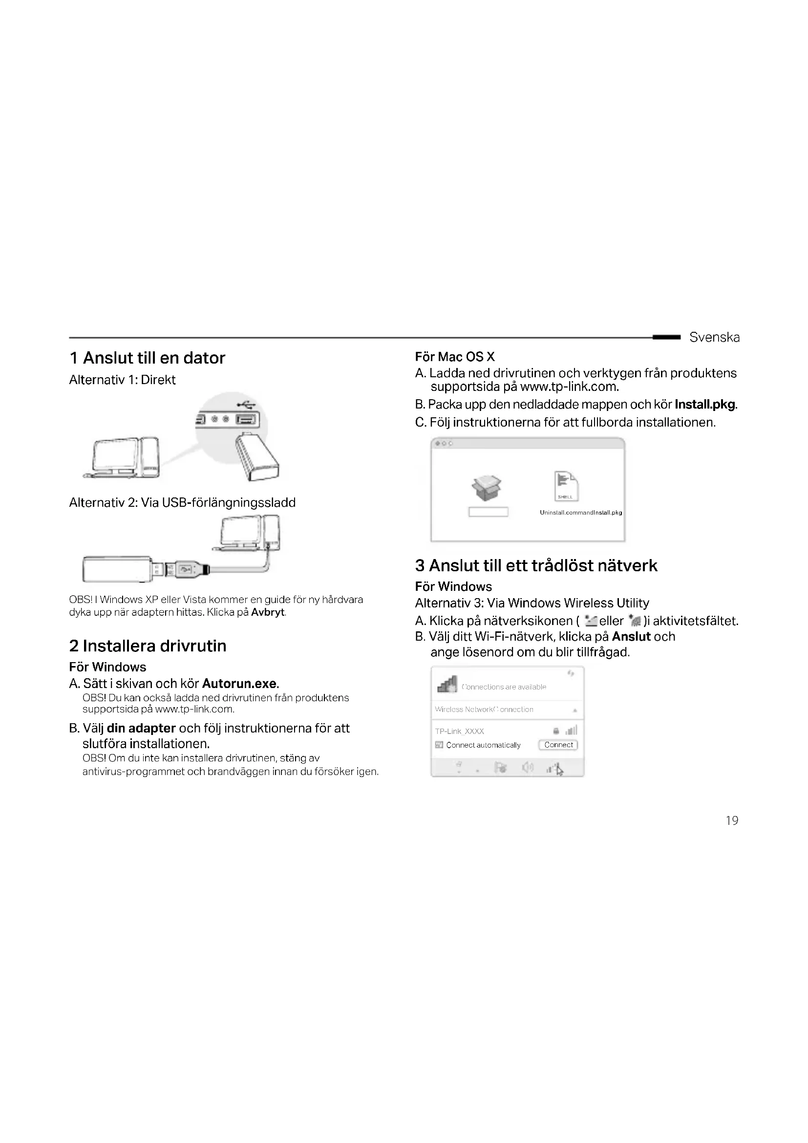 Svenska 1 Anslut till en dator Alternativ 1: Direkt Alternativ 2: Via USB-förlängningssladd OBS! I Windows XP eller Vista kommer en guide för ny hårdvara dyka upp när adaptern hittas. Klicka på Avbryt. 2 Installera drivrutin För Windows A. Sätt i skivan och kör Autorun.exe. OBS! Du kan också ladda ned drivrutinen från produktens supportsida på www.tp-link.com. B. Välj din adapter och följ instruktionerna för att slutföra installationen. OBS! Om du inte kan installera drivrutinen, stäng av antivirus-programmet och brandväggen innan du försöker igen. För Mac OS X A. Ladda ned drivrutinen och verktygen från produktens supportsida på www.tp-link.com. B. Packa upp den nedladdade mappen och kör Install.pkg. C. Följ instruktionerna för att fullborda installationen. 3 Anslut till ett trådlöst nätverk För Windows Alternativ 3: Via Windows Wireless Utility A. Klicka på nätverksikonen ( eller )i aktivitetsfältet. B. Välj ditt Wi-Fi-nätverk, klicka på Anslut och ange lösenord om du blir tillfrågad. Uninstall.commandInstall.pkgSHELL