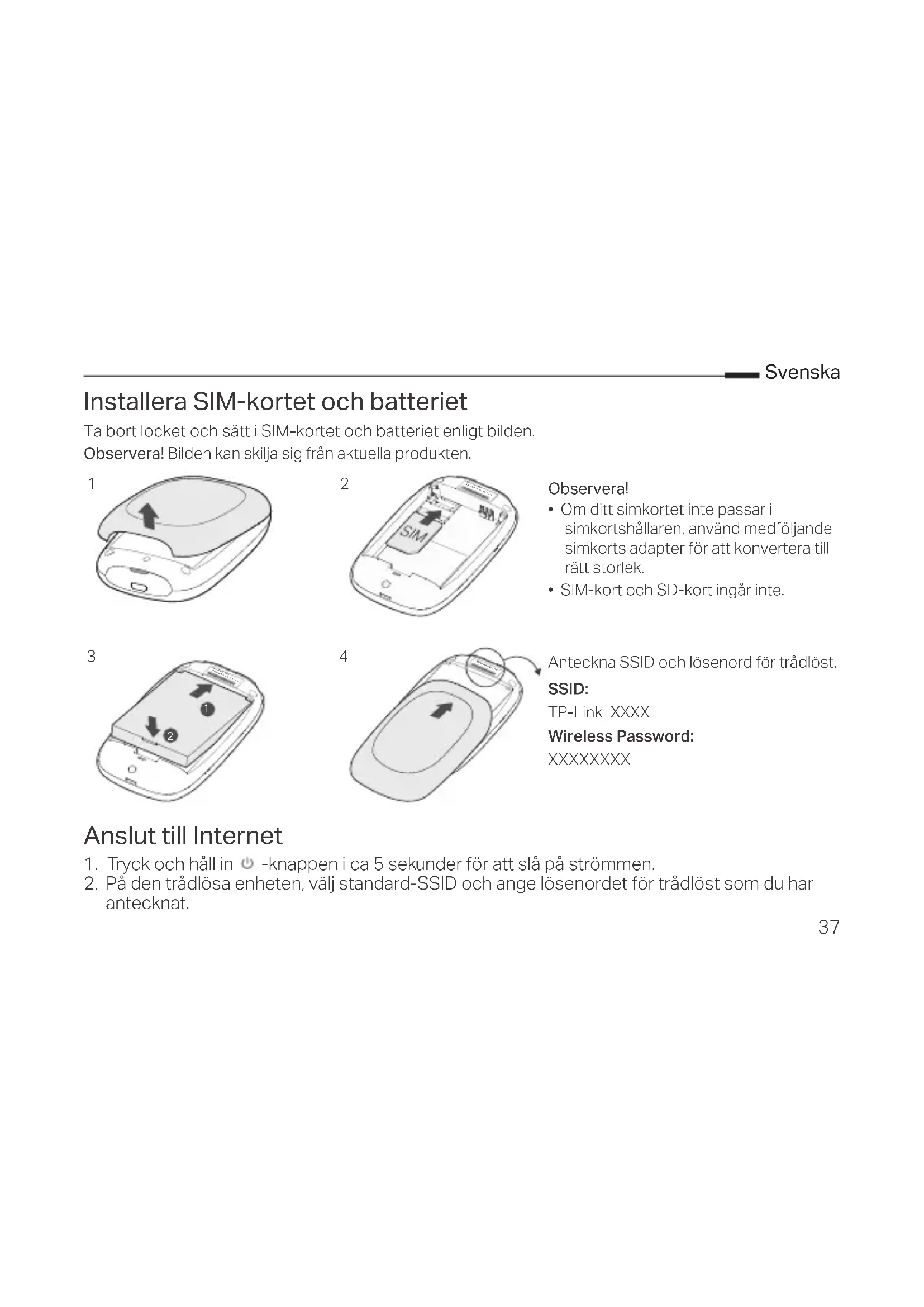 - SIM-kort och SD-kort ingår inte. Anteckna SSID och lösenord för trådlöst. SSID: TP-Link_XXXX Wireless Password: XXXXXXXX38 Svenska Obs! Vi rekommenderar att du ändrar standardinställningarna för trådlös namn och lösenord för nät- verkssäkerhet. Njut! Obs!
