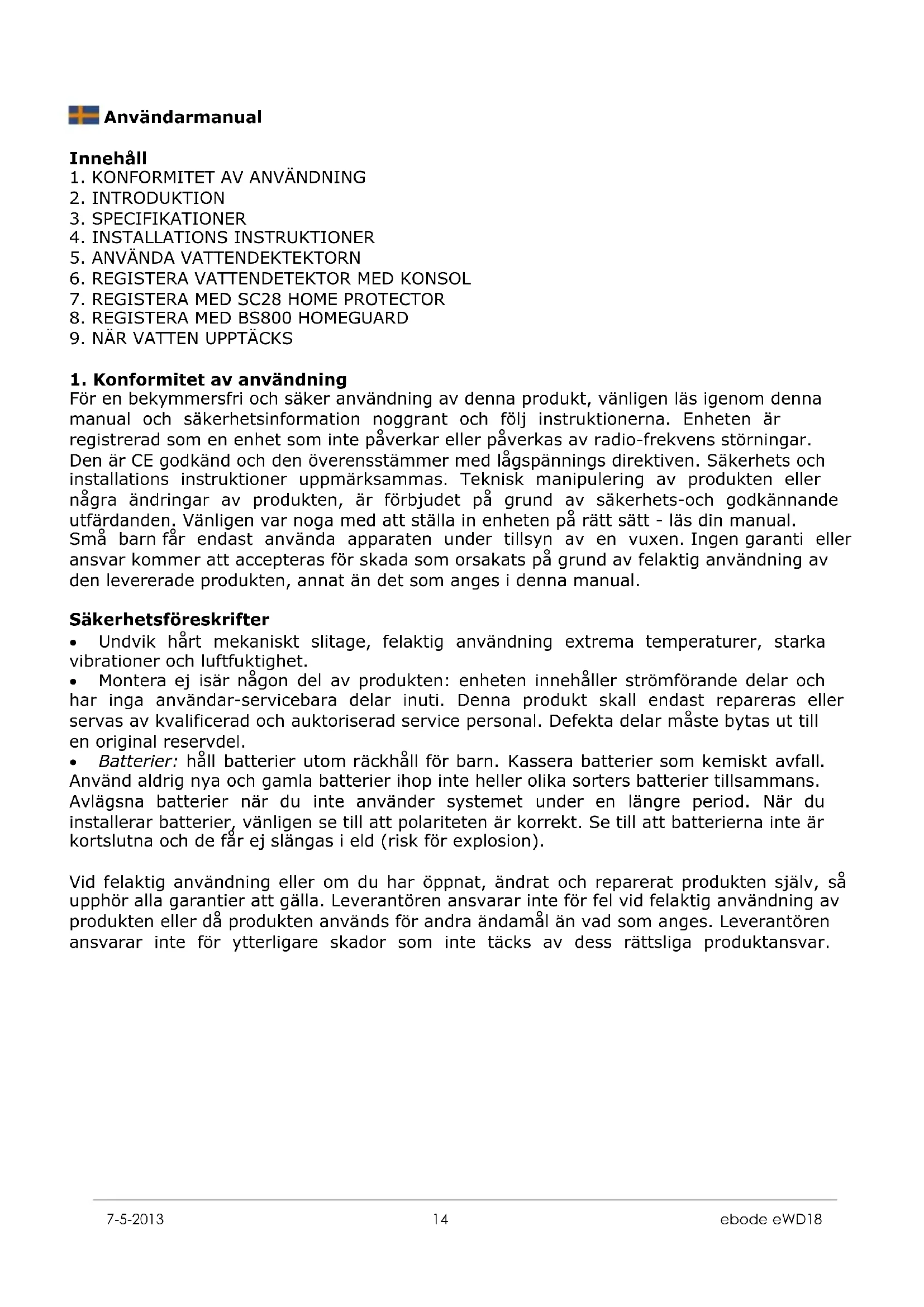 Grattis till ditt köp av en ebode eWD18. Bli varnad om översvämning och ingrip snabbare för att undvika vattenskador. Ebode vattendetektor är batteridriven och har 2 sensorer som måste placeras på plats där vatten kan förväntas uppkomma. Vid upptäckt av vatten eller dukt så kommer eWD18 att ljuda ett alarm (85DB), som en rökdetektor fungerar som ett eget system. För att registrera eWD18 till ett X-10 nätverk (BS800 HomeGuard och ProtectorPlus BS880/4 och BS880/7), vattendetektorn är en del av din X10 säkerhets system och här kommer ett alarm meddelande kommer även att visas. För mer information vänligen se HomeGuard and ProtectorPlus manualerna. eWD18 kan användas med följande säkerhets konsoler: SC28 Home Protector BS800 HomeGuard eWD18 kan även användas som en ensam enhet utan konsol.