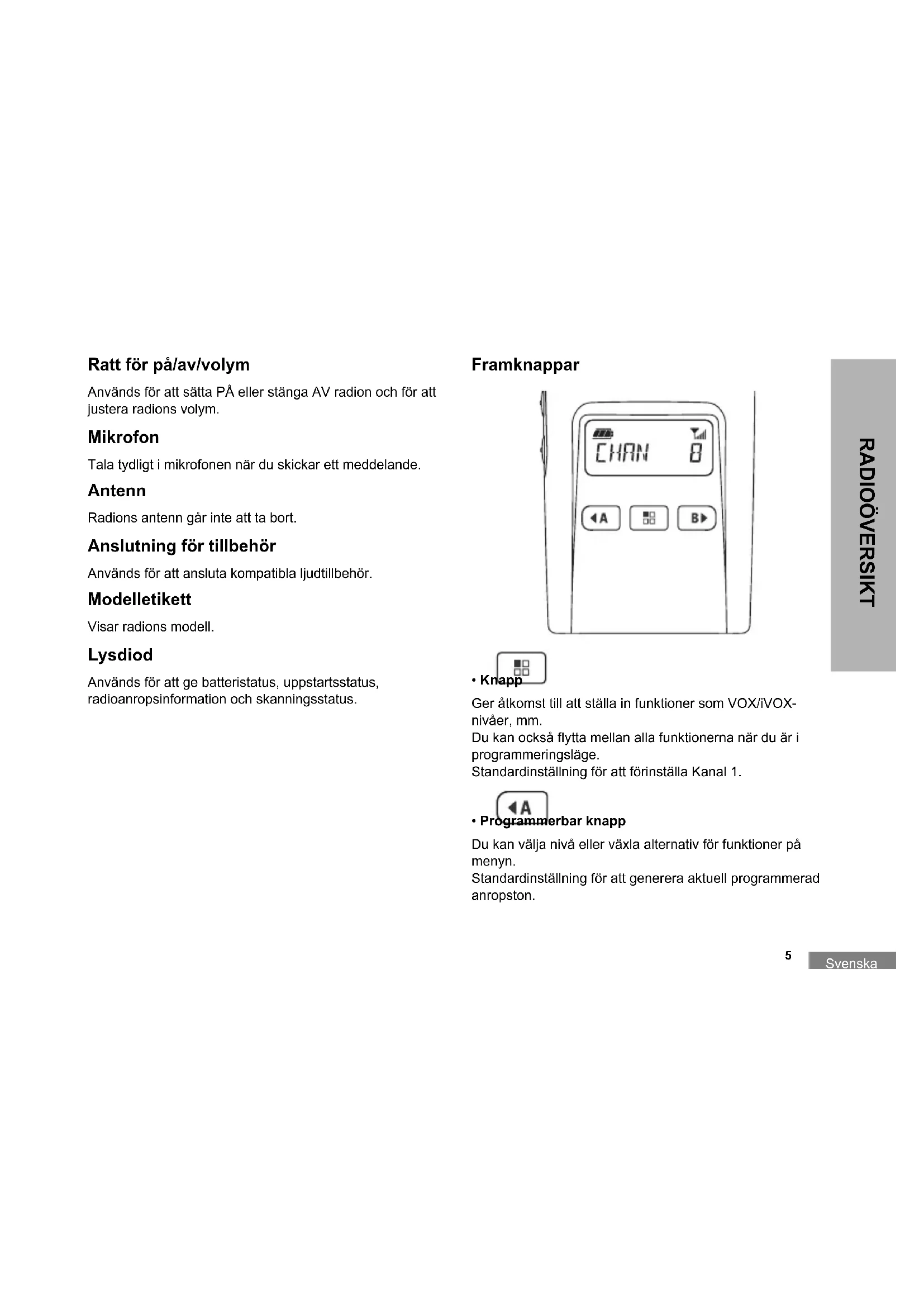 RADIOÖVERSIKT Ratt för på/av/volym Används för att sätta PÅ eller stänga AV radion och för att justera radions volym. Mikrofon Tala tydligt i mikrofonen när du skickar ett meddelande. Antenn Radions antenn går inte att ta bort. Anslutning för tillbehör Används för att ansluta kompatibla ljudtillbehör. Modelletikett Visar radions modell. Lysdiod Används för att ge batteristatus, uppstartsstatus, radioanropsinformation och skanningsstatus. Framknappar