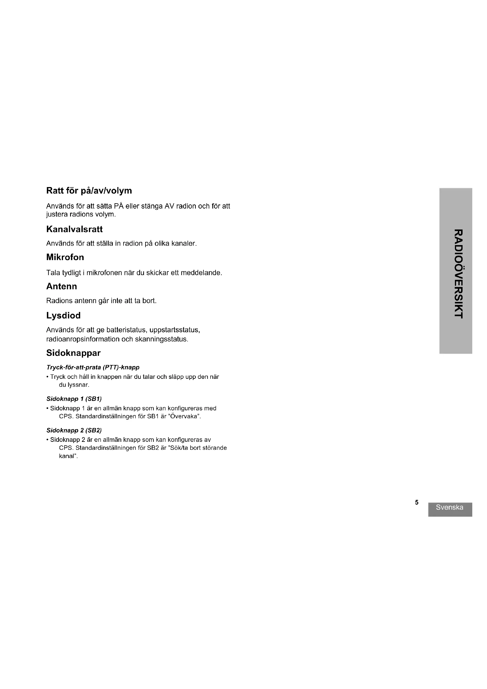 RADIOÖVERSIKT Ratt för på/av/volym Används för att sätta PÅ eller stänga AV radion och för att justera radions volym. Kanalvalsratt Används för att ställa in radion på olika kanaler. Mikrofon Tala tydligt i mikrofonen när du skickar ett meddelande. Antenn Radions antenn går inte att ta bort. Lysdiod Används för att ge batteristatus, uppstartsstatus, radioanropsinformation och skanningsstatus. Sidoknappar Tryck-för-att-prata (PTT)-knapp