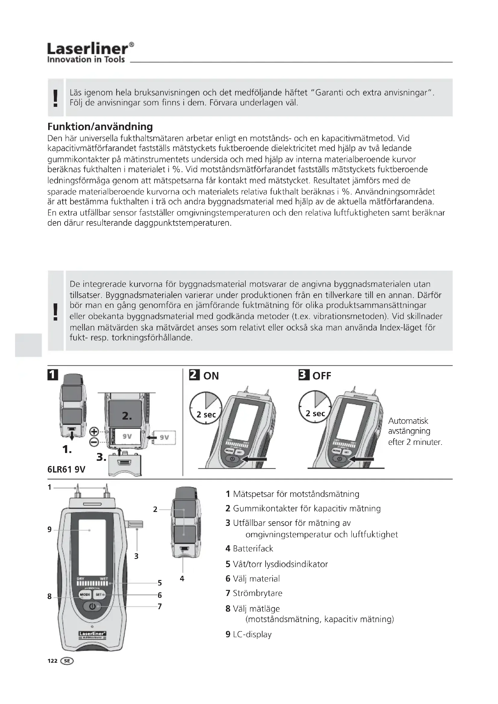 Automatisk avstängning efter 2 minuter. De integrerade kurvorna för byggnadsmaterial motsvarar de angivna byggnadsmaterialen utan tillsatser. Byggnadsmaterialen varierar under produktionen från en tillverkare till en annan. Därför bör man en gång genomföra en jämförande fuktmätning för olika produktsammansättningar eller obekanta byggnadsmaterial med godkända metoder (t.ex. vibrationsmetoden). Vid skillnader mellan mätvärden ska mätvärdet anses som relativt eller också ska man använda Index-läget för fukt- resp. torkningsförhållande.