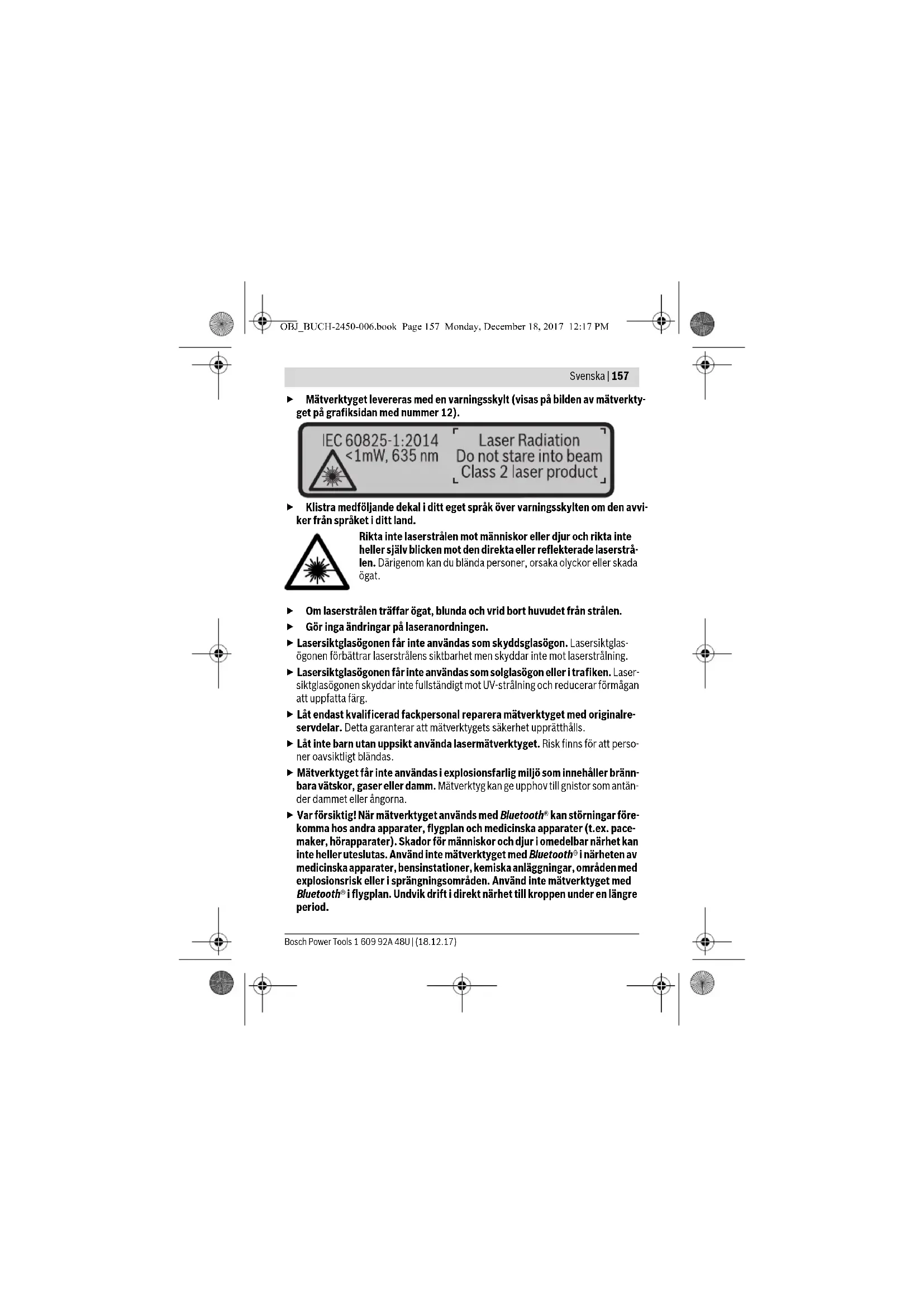 Driftsfrekvensband 2402 – 2480 MHz Max. sändningseffekt 2,5 mW A) Vid mätning från mätverktygets framkant gäller vid mål med hög reflexionsförmåga (t.ex. en vit- målad vägg) att bakgrundsbelysningen skall vara svag och en driftstemperatur på 25°C. Räkna dessutom med en avvikelse på ± 0,05 mm/m. B) Vid mätning från mätverktygets bakkant, gäller stark bakgrundsbelysning och – 10 °C till +45 ° C arbetstemperatur för hög reflektionsförmåga för målet (t.ex. en vit kartong). Dessutom kan påver- kan på ±0,15 mm/m beräknas. C) Efter användarkalibreringen vid 0 ° och 90 ° måste hänsyn tas till ett ytterligare stigningsfel på ±0,01 °/grader upp till 45 ° (max.). Som referensnivå för lutningsmätningen används mätverktygets vänstra sida. D) vid 25 °C driftstemperatur E) Vid kontinuerlig mätning är max. drifttemperatur +40 °C. F) med undantag av batterifack G) Vid Bluetooth®-lågenergienheter (Low Energy) kanske ingen anslutning är möjlig beroende på modell och drivsystem. Bluetooth®-enheter måste ha stöd för SPP-profil. H) Bluetooth® avaktiverad Serienumret 11 på typskylten identifierar mätverktyget entydigt. Digital laseravståndsmätare GLM 50 C OBJ_BUCH-2450-006.book Page 159 Monday, December 18, 2017 12:17 PM160 | Svenska 1 609 92A 48U | (18.12.17) Bosch Power Tools Illustrerade komponenter Numreringen av komponenterna hänvisar till illustration av mätverktyget på grafiksi- dan. 1 Display 2 Mätknapp[ ] 3 Plusknapp[+] 4 Knapp för val av referensplan 5 På-/Av-knapp[ ] 6 Bluetooth®-knappen 7 Funktionsknapp[Func] 8 Minusknapp[–] 9 Batterifackets lock 10 Spärr på batterifackets lock 11 Serienummer 12 Laservarningsskylt 13 1/4"-stativgängning 14 Mottagarlins 15 Laserstrålens utgång 16 Skyddsfodral 17 Lasermåltavla* 18 Lasersiktglasögon* 19 Stativ*