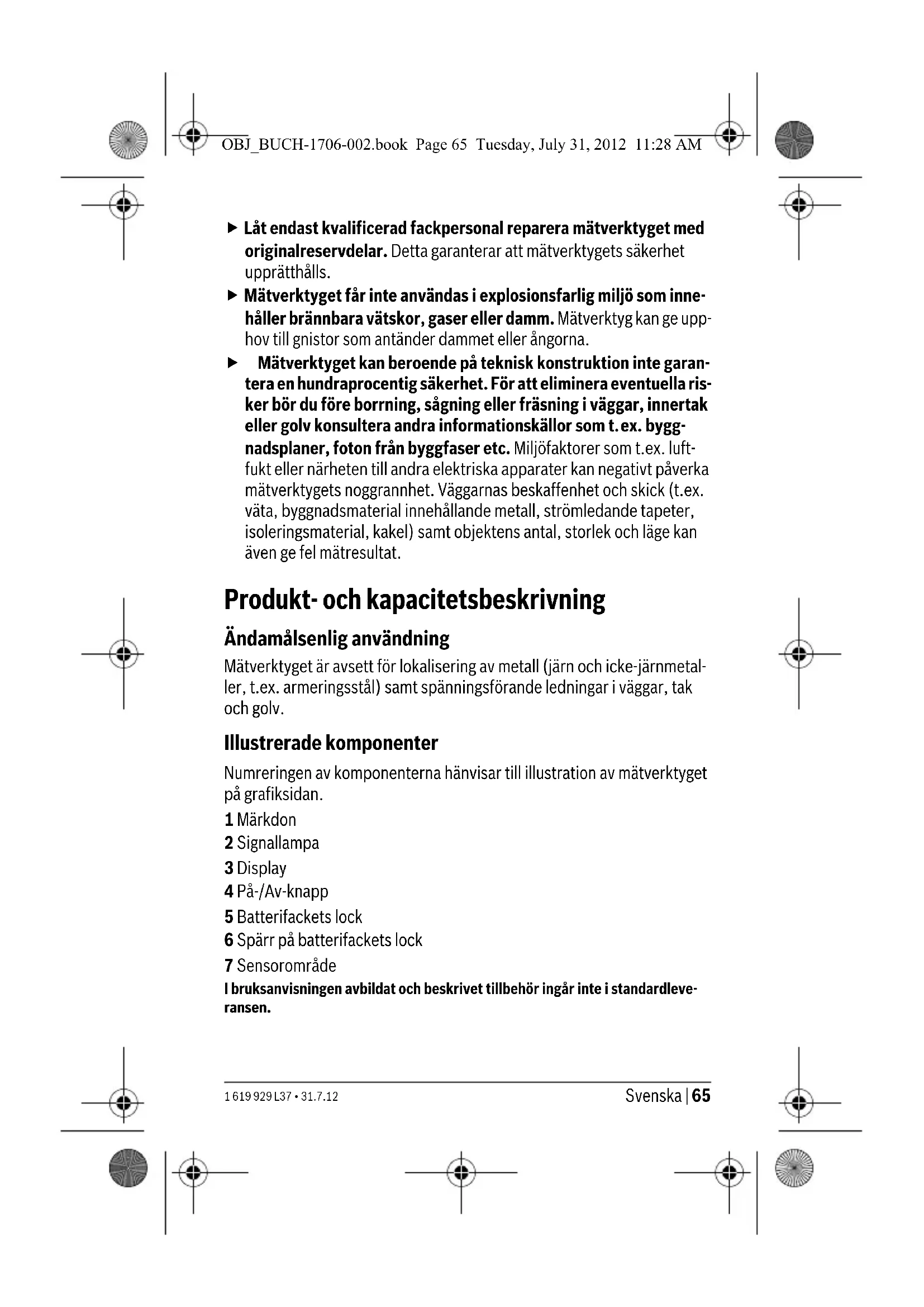 - ringa detekteringsdjup vid icke spänningsförande ledningar f Beroende på objektens material och storlek samt underlagets material och tillstånd kan mätresultatet med avseende på lokaliseringsdjup och noggrann- het bli sämre. OBJ_BUCH-1706-002.book Page 66 Tuesday, July 31, 2012 11:28 AMSvenska | 67 1 619 929 L37 • 31.7.12 Drift Driftstart f Skydda mätverktyget mot väta och direkt solljus. f Utsätt inte mätverktyget för extrema temperaturer eller tempera- turväxlingar. Lämna inte mätverktyget under en längre tid t.ex. i bilen. Om mätverktyget varit utsatt för större temperaturväxlingar låt det balanseras innan du använder det. Vid extrem temperatur eller tempera- turväxlingar kan mätverktygets precision påverkas menligt. f Undvik att utsätta mätverktyget för kraftiga stötar eller fall. In- och urkoppling f Kontrollera innan mätverktyget kopplas på att sensorområdet 7 inte är fuktigt. Om så behövs torka av mätverktyget med en trasa. Tryck för Inkoppling av mätverktyget På-Av-knappen 4. Efter en kort självtest är mätverktyget driftklart. När mätverktyget är drift- klart dyker en bock upp vid kalibreringsindikeringen ”AutoCal” d. För Frånkoppling av mätverktyget tryck på På-Av-knappen 4. Efter ca 10 min utan mätning stängs mätverktyget automatisk av för att skona batteriet. f Innan borrning, sågning eller fräsning utförs i väggen, ska du kon- sultera andra informationskällor för att säkra dig mot risker. Efter- som miljöfaktorer eller väggens beskaffenhet kan påverka mätresulta- ten, finns risker, även om inget objekt påvisas i sensorområdet (signallampan 2 lyser med grönt ljus). Driftsätt Mätverktyget detekterar objekt under sensorområdet 7. Sökning av metallobjekt Efter tillslag lyser signallampan 2 med grönt ljus. Placera mätverktyget på den yta som ska undersökas och förflytta det i sidled. – Om i objektet inget metallobjekt identifieras fortsätter signallampan 2 att lysa med grönt ljus, i mätvärdesstapeln c visas ingen stapel och ingen ljudsignal avges. – När mätverktyget närmar sig ett metallobjekt, visas en stapel i mätvär- desstapeln c och signallampan 2 lyser orange (orangefärgen varierar allt- efter blickvinkel och ljusinfall). OBJ_BUCH-1706-002.book Page 67 Tuesday, July 31, 2012 11:28 AM68 | Svenska 1 619 929 L37 • 31.7.12 – Ovanför ett metallobjekt lyser signallampan 2 med rött ljus, i mätvärdes- stapeln c dyker flera staplar upp och en kontinuerlig ljudsignal avges. f Även om signallampan 2 lyser med orange ljus kan ett metallob- jekt finnas under sensorområdet. När metallobjektet passeras första gången visas det rätt grovt. När mätverktyget förs flera gånger över metallobjektet blir objektidentifieringen allt mer exakt. Efter flera passager (utan att mätverktyget lyftas upp från underlaget) kan metallobjektets läge exakt indike- ras: Lyser signallampan 2 med rött ljus och avges en ljudsignal, ligger metallobjektet under sensorns cen- trum. Sökning av spänningsförande ledningar Mätverktyget indikerar ledningar som har en spänning mellan 110 V och 400 V och en frekvens som motsvarar gängse standard (växelström med 50 eller 60 Hz). Andra ledningar (med likström, högre/lägre frekvens eller spänning) samt ledningar utan spänning kan inte tillförlitligt hittas, men eventuellt visas de som metallobjekt. Vid varje mätning uppsöks automatiskt spänningsförande ledningar. När en spänningsförande ledning lokaliserats visar displayen b. Fortsätt att förflytta mätverktyget över ytan för exaktare lokalisering av den spän- ningsförande ledningen. Efter upprepade passager visas den spännings- förande ledningen exakt. Är mätverktyget mycket nära ledningen blinkar signallampan 2 med rött ljus och en ljudsignal avges i korta intervaller. Spänningsförande ledningar kan lokaliseras lättare om strömförbrukare (t.ex. lampor, apparater) är anslutna till ledningen och påkopplade. Led- ningar med 110 V, 230 V och 400 V (trefasström) kan lokaliseras med ungefär samma effekt. Under vissa villkor (som t.ex. bakom metallytor eller bakom ytor med hög vattenhalt) kan spänningsförande ledningar inte alltid upptäckas. Om ett mätvärde c visas över ett större område avskärmar materialet elektriskt och lokaliseringen av spänningsförande ledningar är inte tillförlitlig. Arbetsanvisningar f Mätresultaten kan principberoende menligt påverkas av vissa omgivningsvillkor. Detta kan t.ex. vara apparater i närheten som alstrar kraftiga magnetiska eller el-magnetiska fält, väta, metall- haltiga byggmaterial, aluminiumdubblerade isoleringsmaterial OBJ_BUCH-1706-002.book Page 68 Tuesday, July 31, 2012 11:28 AMSvenska | 69 1 619 929 L37 • 31.7.12 eller ledande tapeter och kakel. Konsultera före borrning, sågning eller fräsning i väggar, tak eller golv även andra informationskällor (t.ex. byggnadsritningar). Uppmärkning av objekt Lokaliserade objekt kan vid behov märkas ut. Vid maximalt utslag i mät- värdesstapeln c befinner sig objektets centrum direkt under signallampan 2 i centrum på sensorområdet 7. Objektets gränser kan hittas med hjälp av att signallampan 2 växlar från orange till rött ljus. Märk stället på väggen med de tre märkdonen 1. Indikering ”AutoCal” Blinkar bocken bakom kalibrerinssymbolen ”AutoCal” d under en längre tid eller inte alls, är en pålitlig mätning inte längre möjlig. Skicka i detta fall mätverktyget till en auktoriserad Bosch-serviceverkstad. Underhåll och service Underhåll och rengöring Om mätvärdesstapeln c ger ett konstant utslag även om inget metallob- jekt finns i närheten av mätverktyget kan det kalibreras manuellt. Avlägsna alla objekt som finns i närheten av mätverktyget (även arm- bandsur och metallring) och håll mätverktyget i luften. Tryck vid från- kopplat mätverktyg På-Av-knappen 4 tills signallampan 2 lyser med orange ljus. Släpp sedan knappen. Om 