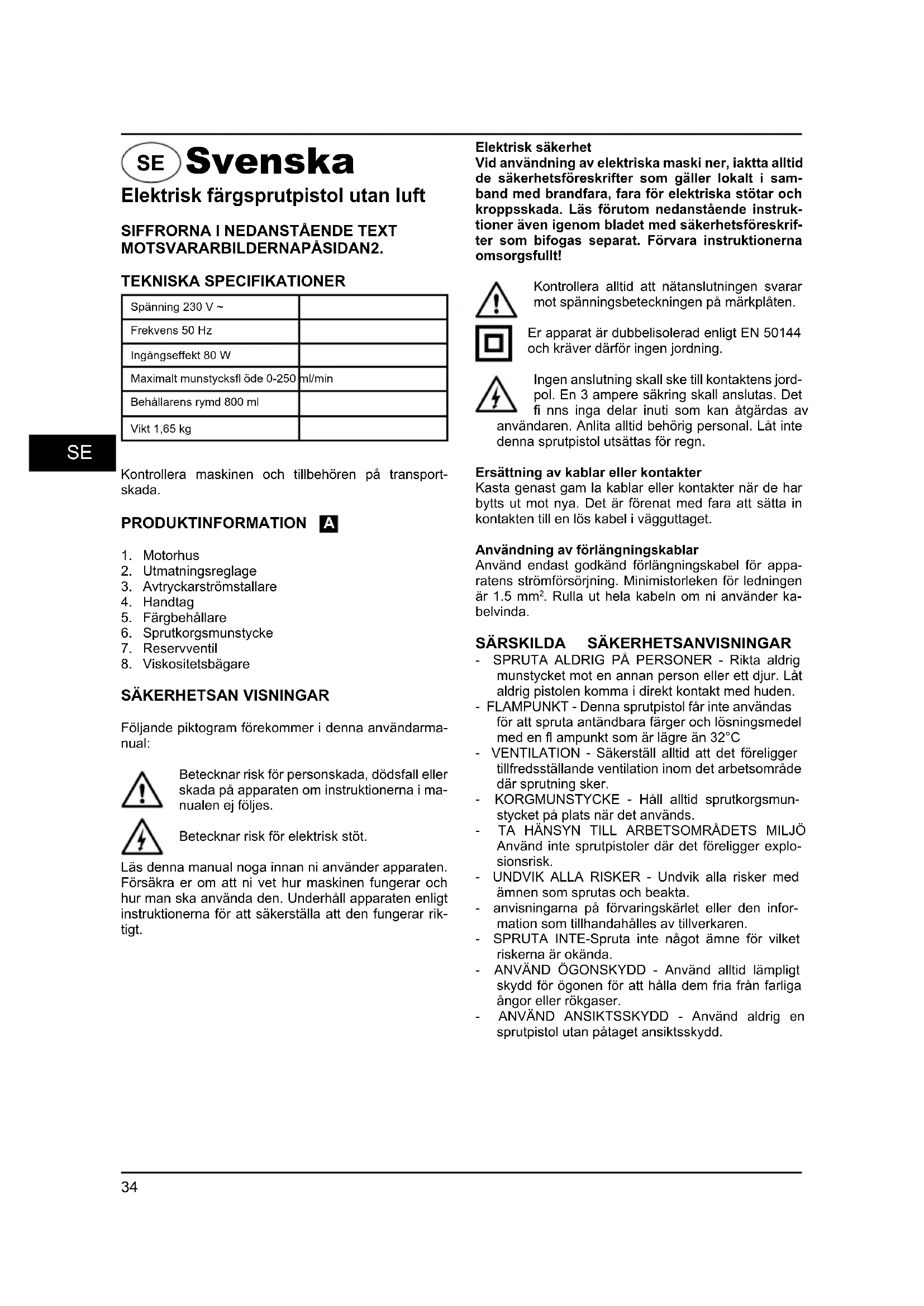 Följande piktogram förekommer i denna användarma- nual: Betecknar risk för personskada, dödsfall eller skada på apparaten om instruktionerna i ma- nualen ej följes. Betecknar risk för elektrisk stöt. Läs denna manual noga innan ni använder apparaten. Försäkra er om att ni vet hur maskinen fungerar och hur man ska använda den. Underhåll apparaten enligt instruktionerna för att säkerställa att den fungerar rik- tigt. Elektrisk säkerhet Vid användning av elektriska maski ner, iaktta alltid de säkerhetsföreskrifter som gäller lokalt i sam- band med brandfara, fara för elektriska stötar och kroppsskada. Läs förutom nedanstående instruk- tioner även igenom bladet med säkerhetsföreskrif- ter som bifogas separat. Förvara instruktionerna omsorgsfullt! Kontrollera alltid att nätanslutningen svarar mot spänningsbeteckningen på märkplåten. Er apparat är dubbelisolerad enligt EN 50144 och kräver därför ingen jordning. Ingen anslutning skall ske till kontaktens jord- pol. En 3 ampere säkring skall anslutas. Det fi nns inga delar inuti som kan åtgärdas av användaren. Anlita alltid behörig personal. Låt inte denna sprutpistol utsättas för regn. Ersättning av kablar eller kontakter Kasta genast gam la kablar eller kontakter när de har bytts ut mot nya. Det är förenat med fara att sätta in kontakten till en lös kabel i vägguttaget. Användning av förlängningskablar Använd endast godkänd förlängningskabel för appa- ratens strömförsörjning. Minimistorleken för ledningen är 1.5 mm