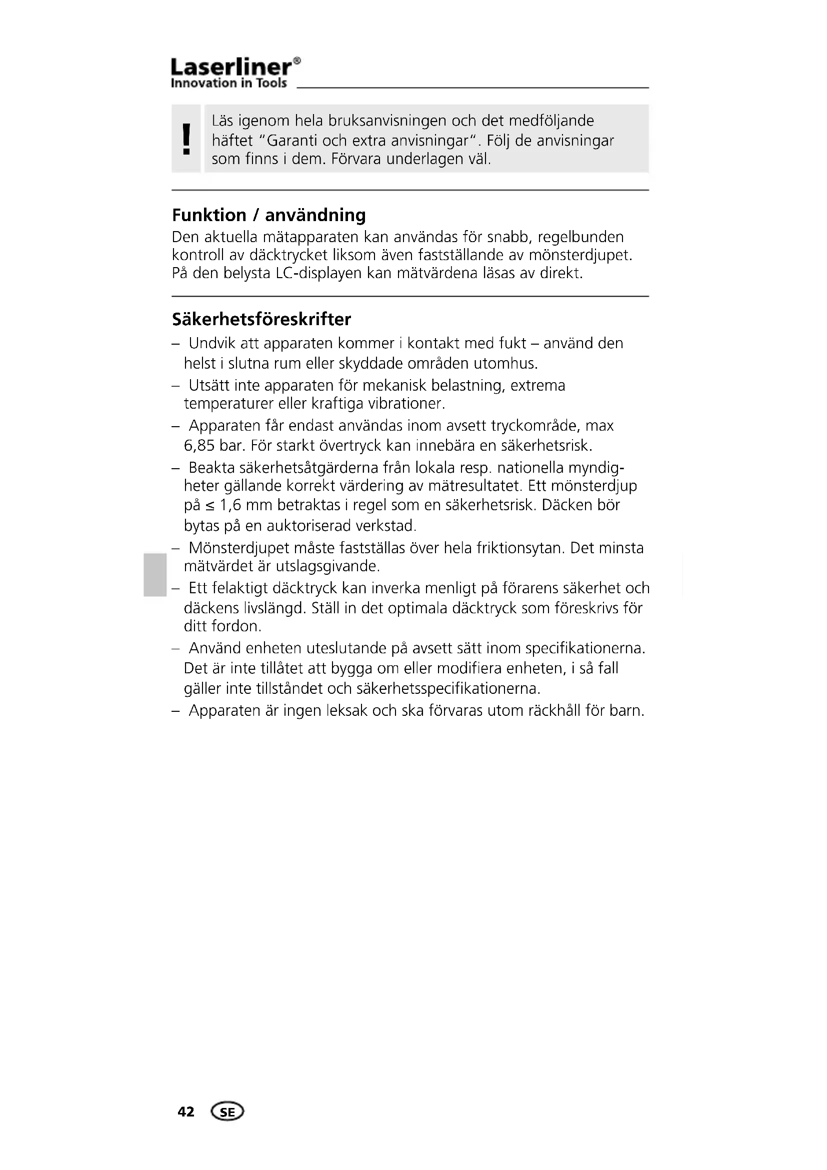 Funktion / användning Den aktuella mätapparaten kan användas för snabb, regelbunden kontroll av däcktrycket liksom även fastställande av mönsterdjupet. På den belysta LC-displayen kan mätvärdena läsas av direkt. Säkerhetsföreskrifter – Undvik att apparaten kommer i kontakt med fukt – använd den helst i slutna rum eller skyddade områden utomhus. – Utsätt inte apparaten för mekanisk belastning, extrema temperaturer eller kraftiga vibrationer. – Apparaten får endast användas inom avsett tryckområde, max 6,85 bar. För starkt övertryck kan innebära en säkerhetsrisk. – Beakta säkerhetsåtgärderna från lokala resp. nationella myndig- heter gällande korrekt värdering av mätresultatet. Ett mönsterdjup på ≤ 1,6 mm betraktas i regel som en säkerhetsrisk. Däcken bör bytas på en auktoriserad verkstad. – Mönsterdjupet måste fastställas över hela friktionsytan. Det minsta mätvärdet är utslagsgivande. – Ett felaktigt däcktryck kan inverka menligt på förarens säkerhet och däckens livslängd. Ställ in det optimala däcktryck som föreskrivs för ditt fordon. – Använd enheten uteslutande på avsett sätt inom specifikationerna. Det är inte tillåtet att bygga om eller modifiera enheten, i så fall gäller inte tillståndet och säkerhetsspecifikationerna. – Apparaten är ingen leksak och ska förvaras utom räckhåll för barn.TireCheck