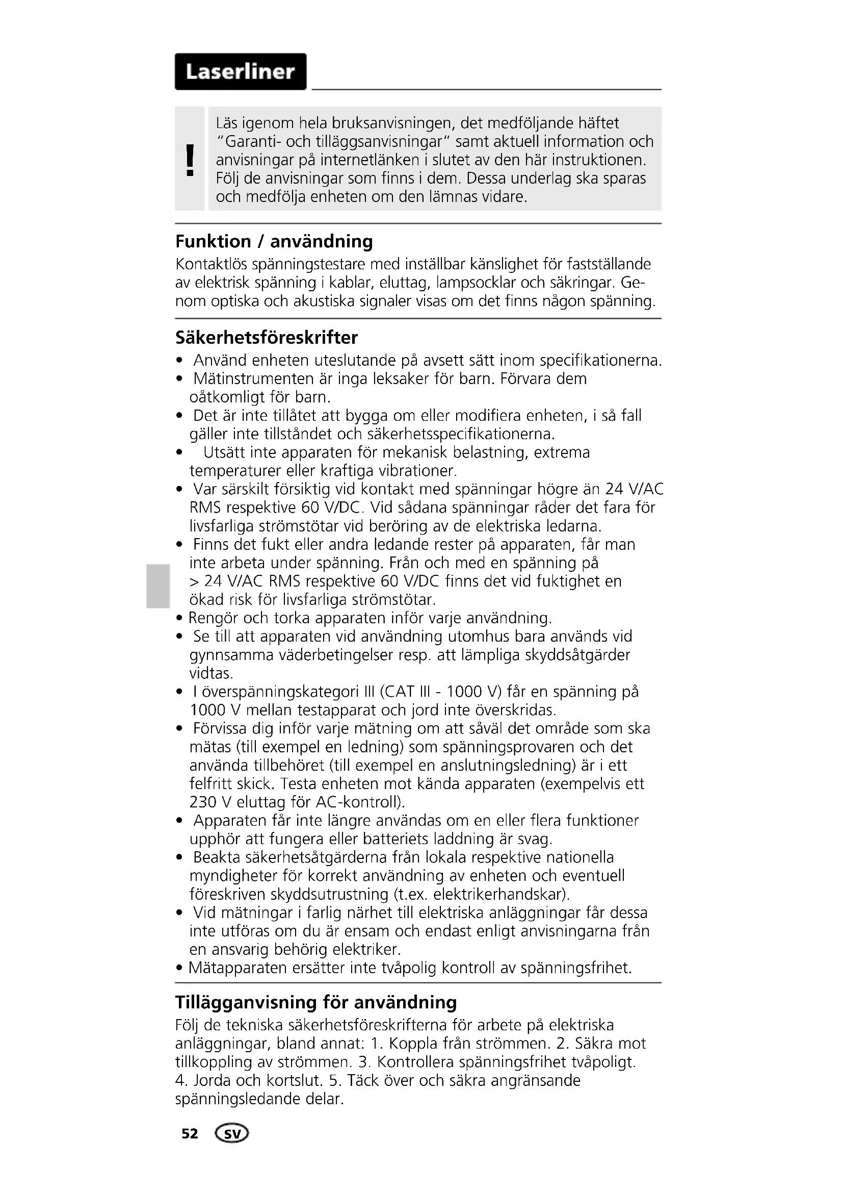 Funktion / användning Kontaktlös spänningstestare med inställbar känslighet för fastställande av elektrisk spänning i kablar, eluttag, lampsocklar och säkringar. Ge- nom optiska och akustiska signaler visas om det finns någon spänning. Säkerhetsföreskrifter