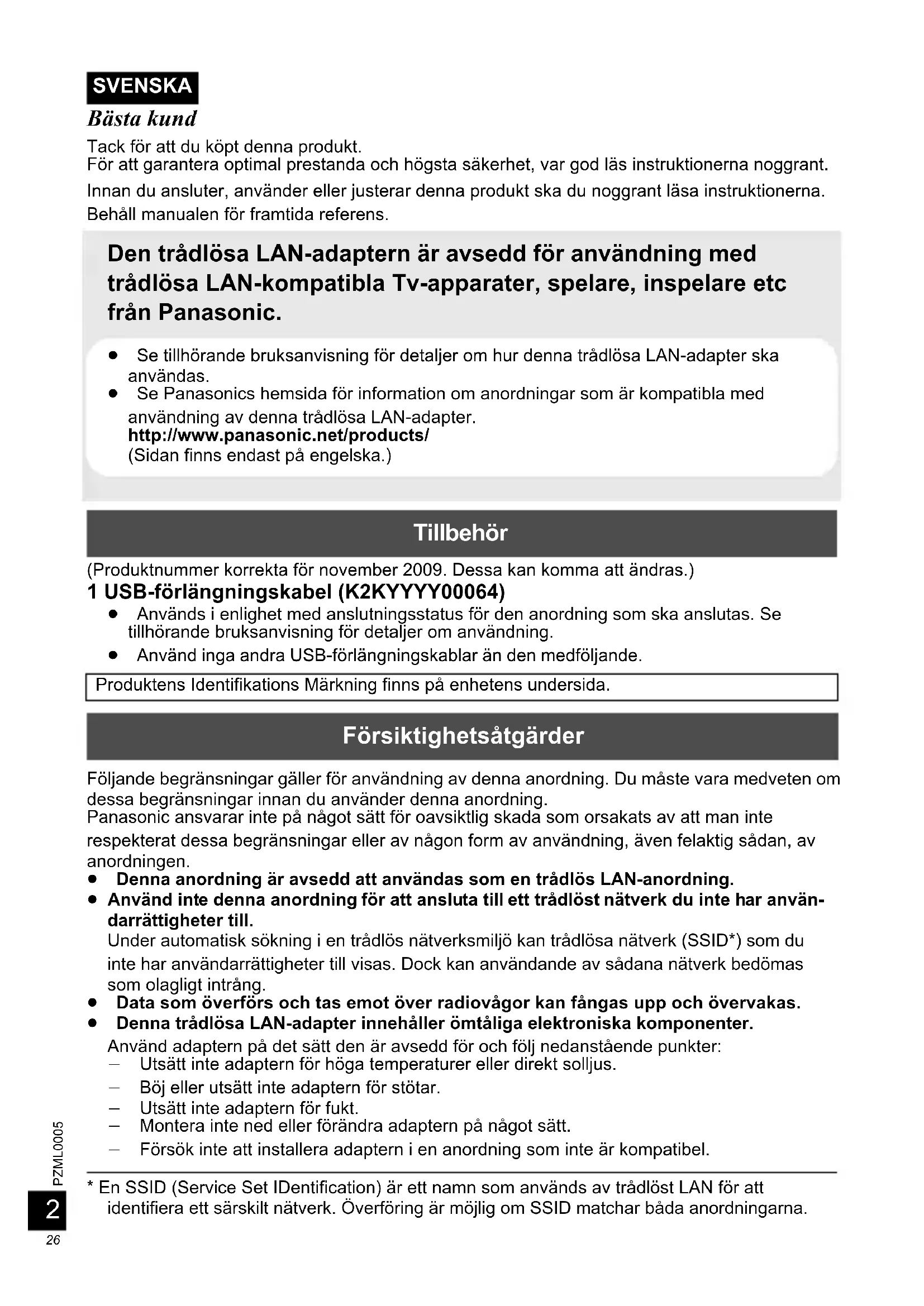 DY-WL10_E.book 25 ページ 2009年12月8日 火曜日 午後3時43分26 PZML0005 Bästa kund Tack för att du köpt denna produkt. För att garantera optimal prestanda och högsta säkerhet, var god läs instruktionerna noggrant. Innan du ansluter, använder eller justerar denna produkt ska du noggrant läsa instruktionerna. Behåll manualen för framtida referens. Den trådlösa LAN-adaptern är avsedd för användning med trådlösa LAN-kompatibla Tv-apparater, spelare, inspelare etc från Panasonic. (Produktnummer korrekta för november 2009. Dessa kan komma att ändras.) 1 USB-förlängningskabel (K2KYYYY00064) ≥ Används i enlighet med anslutningsstatus för den anordning som ska anslutas. Se tillhörande bruksanvisning för detaljer om användning. ≥ Använd inga andra USB-förlängningskablar än den medföljande. Följande begränsningar gäller för användning av denna anordning. Du måste vara medveten om dessa begränsningar innan du använder denna anordning. Panasonic ansvarar inte på något sätt för oavsiktlig skada som orsakats av att man inte respekterat dessa begränsningar eller av någon form av användning, även felaktig sådan, av anordningen. ≥ Denna anordning är avsedd att användas som en trådlös LAN-anordning. ≥ Använd inte denna anordning för att ansluta till ett trådlöst nätverk du inte har använ- darrättigheter till. Under automatisk sökning i en trådlös nätverksmiljö kan trådlösa nätverk (SSID*) som du inte har användarrättigheter till visas. Dock kan användande av sådana nätverk bedömas som olagligt intrång. ≥ Data som överförs och tas emot över radiovågor kan fångas upp och övervakas. ≥ Denna trådlösa LAN-adapter innehåller ömtåliga elektroniska komponenter. Använd adaptern på det sätt den är avsedd för och följ nedanstående punkter: j Utsätt inte adaptern för höga temperaturer eller direkt solljus. j Böj eller utsätt inte adaptern för stötar. j Utsätt inte adaptern för fukt. j Montera inte ned eller förändra adaptern på något sätt. j Försök inte att installera adaptern i en anordning som inte är kompatibel.