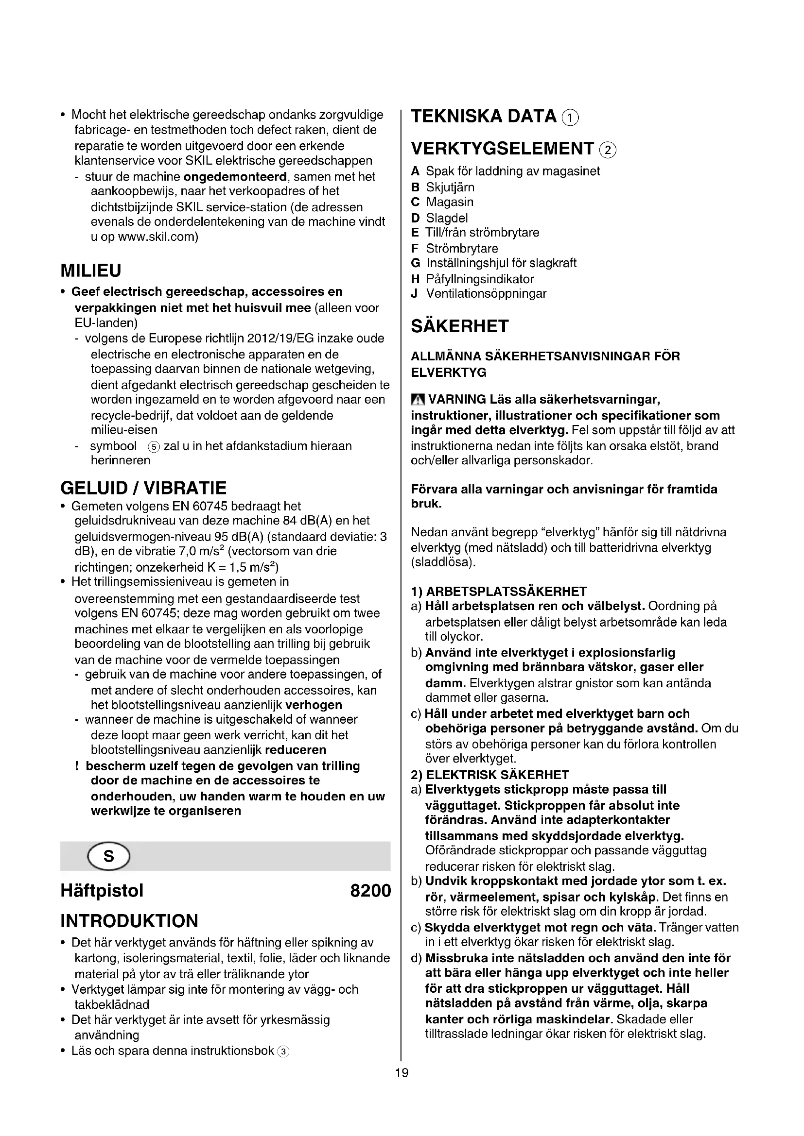 - Om i elverktyget trots exakt tillverkning och sträng kontroll störning skulle uppstå, bör reparation utföras av auktoriserad serviceverkstad för SKIL elverktyg - sänd in verktyget i odemonterat skick tillsammans med inköpsbevis till försäljaren eller till närmaste SKIL serviceverkstad (adresser till servicestationer och sprängskisser av maskiner nns på www.skil.com) MILJÖ