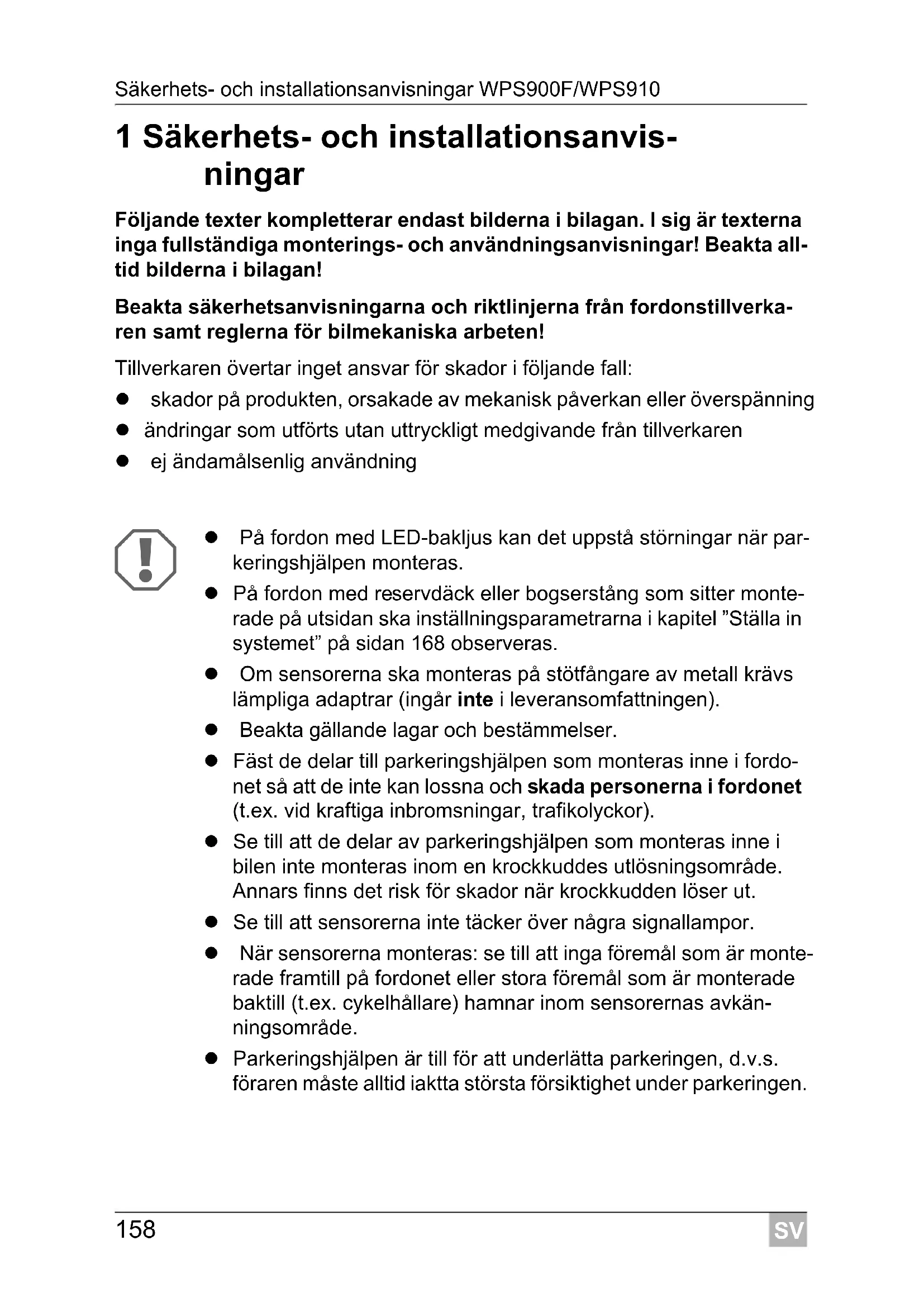 På fordon med LED-bakljus kan det uppstå störningar när par- keringshjälpen monteras. På fordon med reservdäck eller bogserstång som sitter monte- rade på utsidan ska inställningsparametrarna i kapitel ”Ställa in systemet” på sidan 168 observeras. Om sensorerna ska monteras på stötfångare av metall krävs lämpliga adaptrar (ingår inte i leveransomfattningen). Beakta gällande lagar och bestämmelser. Fäst de delar till parkeringshjälpen som monteras inne i fordo- net så att de inte kan lossna och skada personerna i fordonet (t.ex. vid kraftiga inbromsningar, trafikolyckor). Se till att de delar av parkeringshjälpen som monteras inne i bilen inte monteras inom en krockkuddes utlösningsområde. Annars finns det risk för skador när krockkudden löser ut. Se till att sensorerna inte täcker över några signallampor. När sensorerna monteras: se till att inga föremål som är monte- rade framtill på fordonet eller stora föremål som är monterade baktill (t.ex. cykelhållare) hamnar inom sensorernas avkän- ningsområde. Parkeringshjälpen är till för att underlätta parkeringen, d.v.s. föraren måste alltid iaktta största försiktighet under parkeringen.SV WPS900F/WPS910 Leveransomfattning