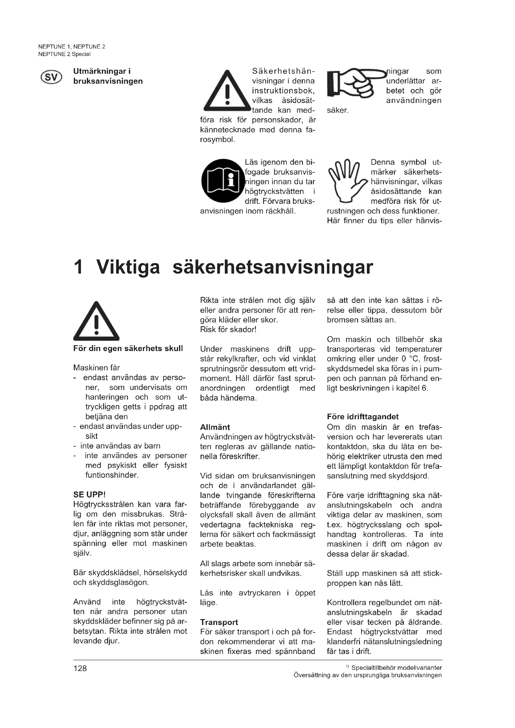 Specialtillbehör modellvarianter Översättning av den ursprungliga bruksanvisningen NEPTUNE 1, NEPTUNE 2 NEPTUNE 2 Special OBSERVERA! Gäller maskiner med slangvinda: Vid användning av hetvatten ska högtrycksslangen rullas av helt från slangvindan, eftersom annars slangvindan kan deformeras av vär- men.