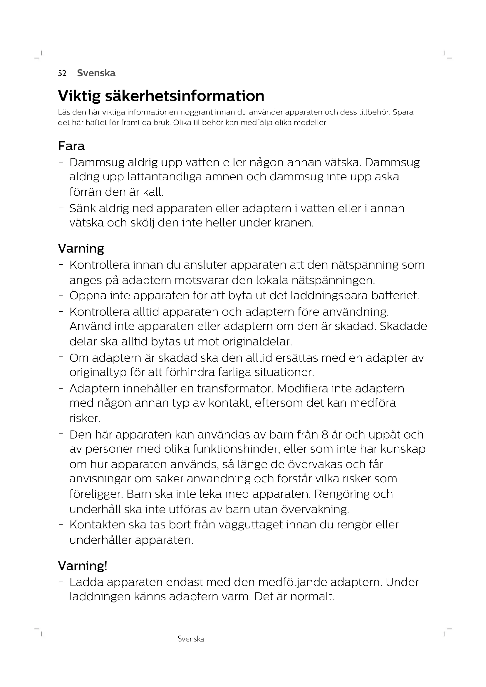 Sänk aldrig ned apparaten eller adaptern i vatten eller i annan vätska och skölj den inte heller under kranen. Varning