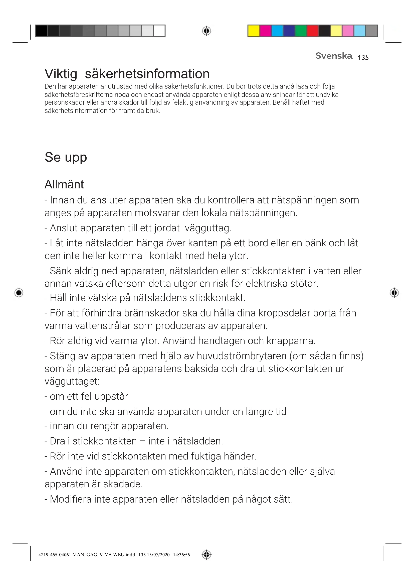 - Reparationer får endast utföras av ett servicecenter som har auktoriserats av Gaggia för att undvika faror. - Apparaten bör inte användas av barn under åtta år. - Den här apparaten kan användas av barn som är över åtta år, personer med olika funktionshinder eller personer som inte har kunskap om hur apparaten används så länge de övervakas och får instruktioner angående säker användning och förstår riskerna med användningen. - Rengöring och underhåll får inte utföras av barn om de inte är över åtta år och övervakas av en vuxen person. - Se till att apparaten och dess nätsladd är placerade utom räckhåll för barn under åtta år. - Låt inte barn leka med apparaten. - Var försiktig när du matar ut varmt vatten. Apparaten kan avge små varma vattenstrålar innan vattnet matas ut. Vänta tills utmatningscykeln är klar innan du tar bort varmvattenmunstycket. Varning! Allmänt - Den här apparaten är endast avsedd för normalt hushållsbruk. Den är inte avsedd för användning i miljöer som personalkök i butiker, kontor, jordbruksföretag eller andra arbetsmiljöer. - Apparaten ska stå på en plan och stabil yta. Den måste alltid förvaras stående, även under transport. - Ställ inte apparaten på en värmeplatta eller nära en ugn, värmare eller annan värmekälla. - Fyll enbart på malt kaffe i den trycksatta lterhållaren. Om du häller i kaffebönor, snabbkaffe, råa kaffebönor eller andra substanser kan apparaten skadas. Om detta inträffar omfattas inte nödvändiga reparationer av garantin. 4219-465-04061 MAN. GAG. VIVA WEU.indd 136 13/07/2020 14:36:56137 Svenska - Låt apparaten svalna innan du sätter i eller tar bort några delar. Uppvärmningsytorna förblir varma även efter användning. - Om det nns ett utsläppsrör för vatten, rör aldrig det under användning då det kan vara kokande varmt. Låt det först svalna. - Fyll aldrig vattenbehållaren med varmt, hett eller kolsyrat vatten eftersom det kan orsaka skador på vattenbehållaren och apparaten. - Rengör aldrig apparaten med skursvampar, slipande rengöringsmedel eller vätskor som bensin eller aceton. Använd endast en mjuk trasa fuktad med vatten. - Kalka av apparaten regelbundet. Om du inte kalkar av apparaten kan den sluta fungera korrekt. Om detta inträffar omfattas inte nödvändiga reparationer av garantin. - Förvara inte apparaten vid temperaturer under 0 °C. Vatten som blir kvar i uppvärmningssystemet kan frysa och orsaka skador. - Lämna inte vatten i vattenbehållaren om du inte ska använda apparaten under en längre tidsperiod. Vattnet kan bli förorenat. Fyll vattenbehållaren med nytt vatten varje gång du använder apparaten. - Använd aldrig tillbehör eller delar från andra tillverkare eller delar som inte uttryckligen har rekommenderats av Gaggia. Om du använder sådana tillbehör eller delar upphör garantin att gälla. - Regelbunden rengöring och underhåll förlänger apparatens livslängd och ger ett kaffe med optimal kvalitet och smak. - Apparaten utsätts hela tiden för fukt, kaffe och kalkavlagringar. Det är därför viktigt att rengöra och underhålla apparaten regelbundet enligt beskrivningen i användarhandboken och på webbplatsen. Om du inte utför rengörings- och underhållsprocedurerna kan din apparat så småningom sluta fungera. Om detta inträffar omfattas inte nödvändiga reparationer av garantin. - Rengör inte den trycksatta lterhållaren i diskmaskinen och använd inte diskmedel eller rengöringsmedel vid rengöringen. Det kan orsaka fel i den trycksatta lterhållaren och påverka kaffets smak på ett negativt sätt. - Torka inte bryggruppen med en handduk eftersom det kan leda till att tygbrer samlas i bryggruppen. 4219-465-04061 MAN. GAG. VIVA WEU.indd 137 13/07/2020 14:36:56Svenska