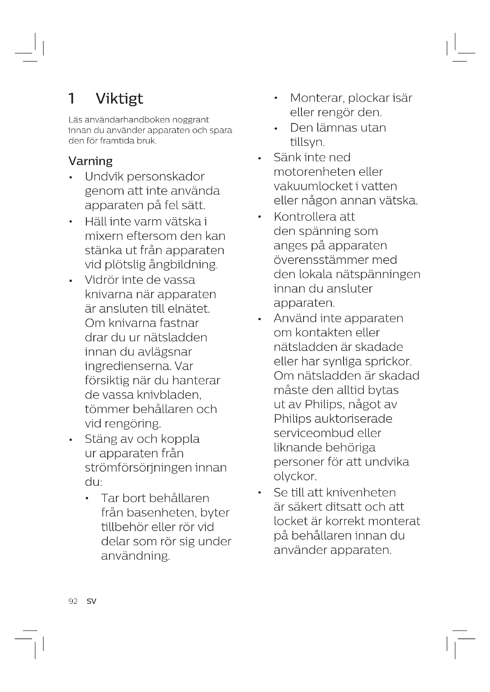 Se till att knivenheten är säkert ditsatt och att locket är korrekt monterat på behållaren innan du använder apparaten. 1 Viktigt Läs användarhandboken noggrant innan du använder apparaten och spara den för framtida bruk. Varning