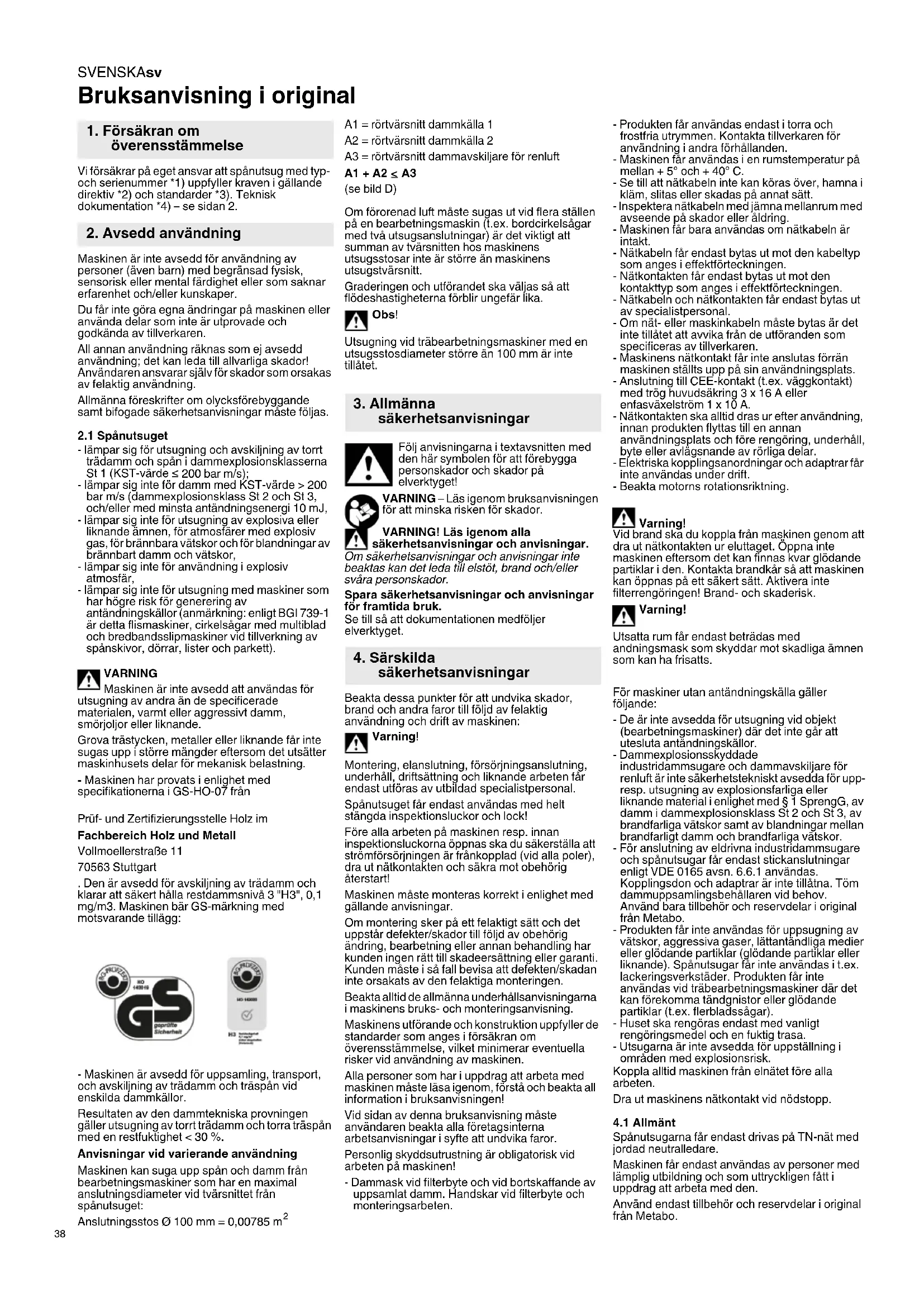 - lämpar sig för utsugning och avskiljning av torrt trädamm och spån i dammexplosionsklasserna St 1 (KST-värde ≤ 200 bar m/s); - lämpar sig inte för damm med KST-värde > 200 bar m/s (dammexplosionsklass St 2 och St 3, och/eller med minsta antändningsenergi 10 mJ, - lämpar sig inte för utsugning av explosiva eller liknande ämnen, för atmosfärer med explosiv gas, för brännbara vätskor och för blandningar av brännbart damm och vätskor, - lämpar sig inte för användning i explosiv atmosfär, - lämpar sig inte för utsugning med maskiner som har högre risk för generering av antändningskällor (anmärkning: enligt BGI 739-1 är detta flismaskiner, cirkelsågar med multiblad och bredbandsslipmaskiner vid tillverkning av spånskivor, dörrar, lister och parkett). VARNING Maskinen är inte avsedd att användas för utsugning av andra än de specificerade materialen, varmt eller aggressivt damm, smörjoljor eller liknande. Grova trästycken, metaller eller liknande får inte sugas upp i större mängder eftersom det utsätter maskinhusets delar för mekanisk belastning. - Maskinen har provats i enlighet med specifikationerna i GS-HO-07 från Prüf- und Zertifizierungsstelle Holz im Fachbereich Holz und Metall Vollmoellerstraße 11 70563 Stuttgart . Den är avsedd för avskiljning av trädamm och klarar att säkert hålla restdammsnivå 3 "H3", 0,1 mg/m3. Maskinen bär GS-märkning med motsvarande tillägg: - Maskinen är avsedd för uppsamling, transport, och avskiljning av trädamm och träspån vid enskilda dammkällor. Resultaten av den dammtekniska provningen gäller utsugning av torrt trädamm och torra träspån med en restfuktighet < 30 %. Anvisningar vid varierande användning Maskinen kan suga upp spån och damm från bearbetningsmaskiner som har en maximal anslutningsdiameter vid tvärsnittet från spånutsuget: Anslutningsstos Ø 100 mm = 0,00785 m