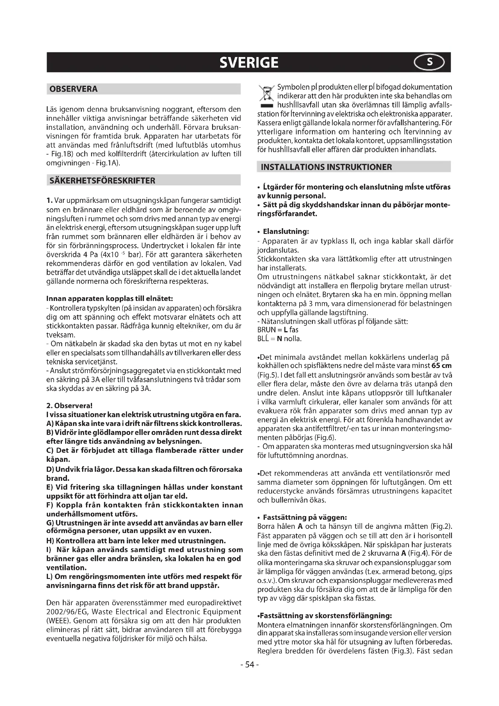 bränner gas eller andra bränslen, ska lokalen ha en god ventilation. L) Om rengöringsmomenten inte utförs med respekt för anvisningarna finns det risk för att brand uppstår. Den här apparaten överensstämmer med europadirektivet 2002/96/EG, Waste Electrical and Electronic Equipment (WEEE). Genom att försäkra sig om att den här produkten elimineras pĺ rätt sätt, bidrar användaren till att förebygga eventuella negativa följdrisker för miljö och hälsa. Symbolen pĺ produkten eller pĺ bifogad dokumentation indikerar att den här produkten inte ska behandlas om hushĺllsavfall utan ska överlämnas till lämplig avfalls- station för ĺtervinning av elektriska och elektroniska apparater. Kassera enligt gällande lokala normer för avfallshantering. För ytterligare information om hantering och ĺtervinning av produkten, kontakta det lokala kontoret, uppsamllingsstation för hushĺllsavfall eller affären där produkten inhandlats. INSTALLATIONS INSTRUKTIONER