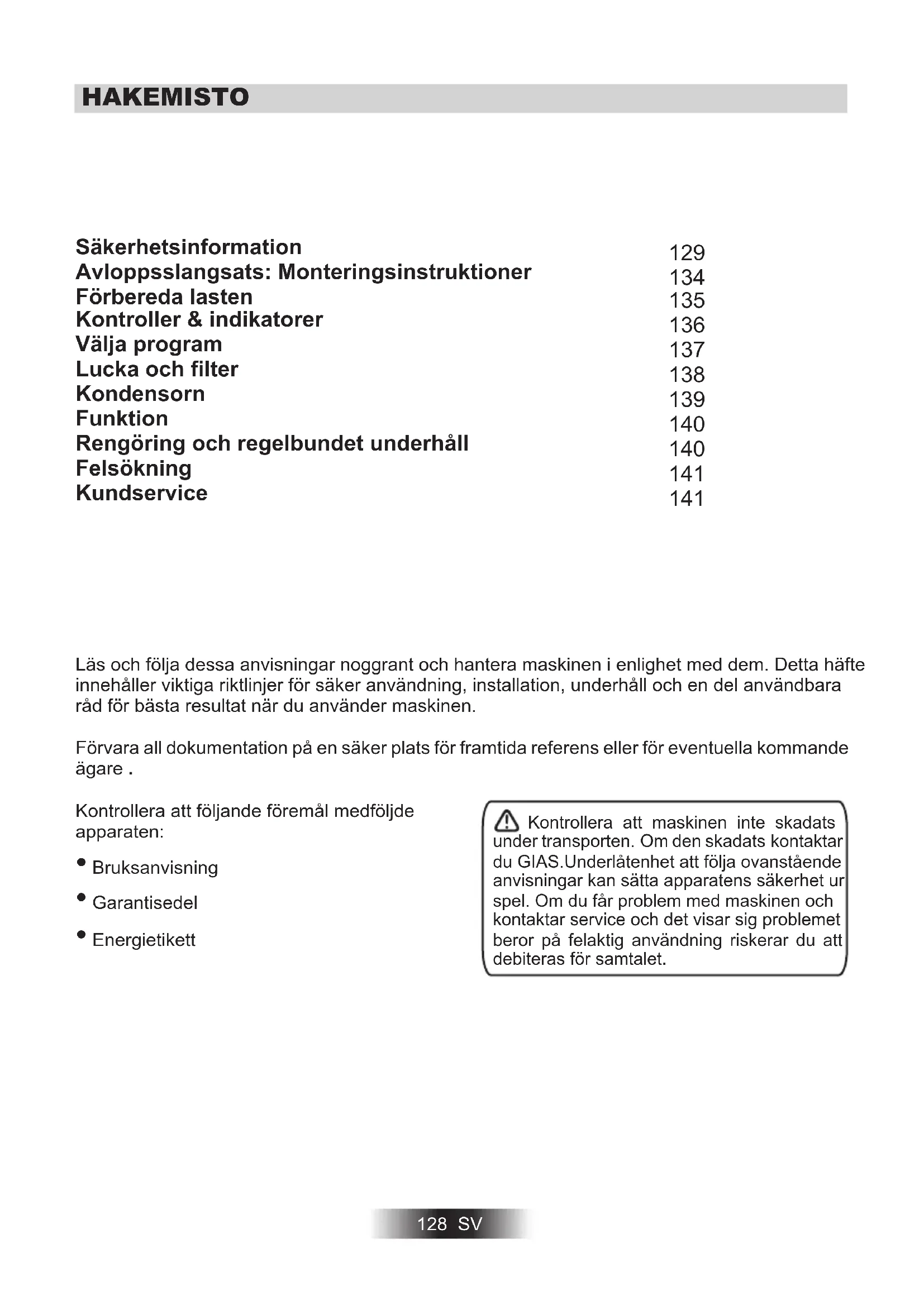 - Energietikett Läs och följa dessa anvisningar noggrant och hantera maskinen i enlighet med dem. Detta häfte innehåller viktiga riktlinjer för säker användning, installation, underhåll och en del användbara råd för bästa resultat när du använder maskinen. Förvara all dokumentation på en säker plats för framtida referens eller för eventuella kommande ägare . Kontrollera att maskinen inte skadats under transporten. Om den skadats kontaktar du GIAS.Underlåtenhet att följa ovanstående anvisningar kan sätta apparatens säkerhet ur spel. Om du får problem med maskinen och kontaktar service och det visar sig problemet beror på felaktig användning riskerar du att debiteras för samtalet. HAKEMISTO