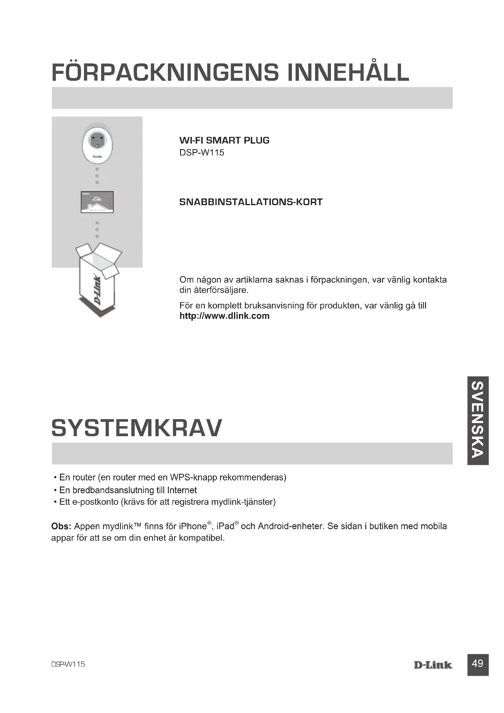 och Android-enheter. Se sidan i butiken med mobila appar för att se om din enhet är kompatibel. Om någon av artiklarna saknas i förpackningen, var vänlig kontakta din återförsäljare. För en komplett bruksanvisning för produkten, var vänlig gå till http://www.dlink.com SNABBINSTALLATIONS-KORT SYSTEMKRAV