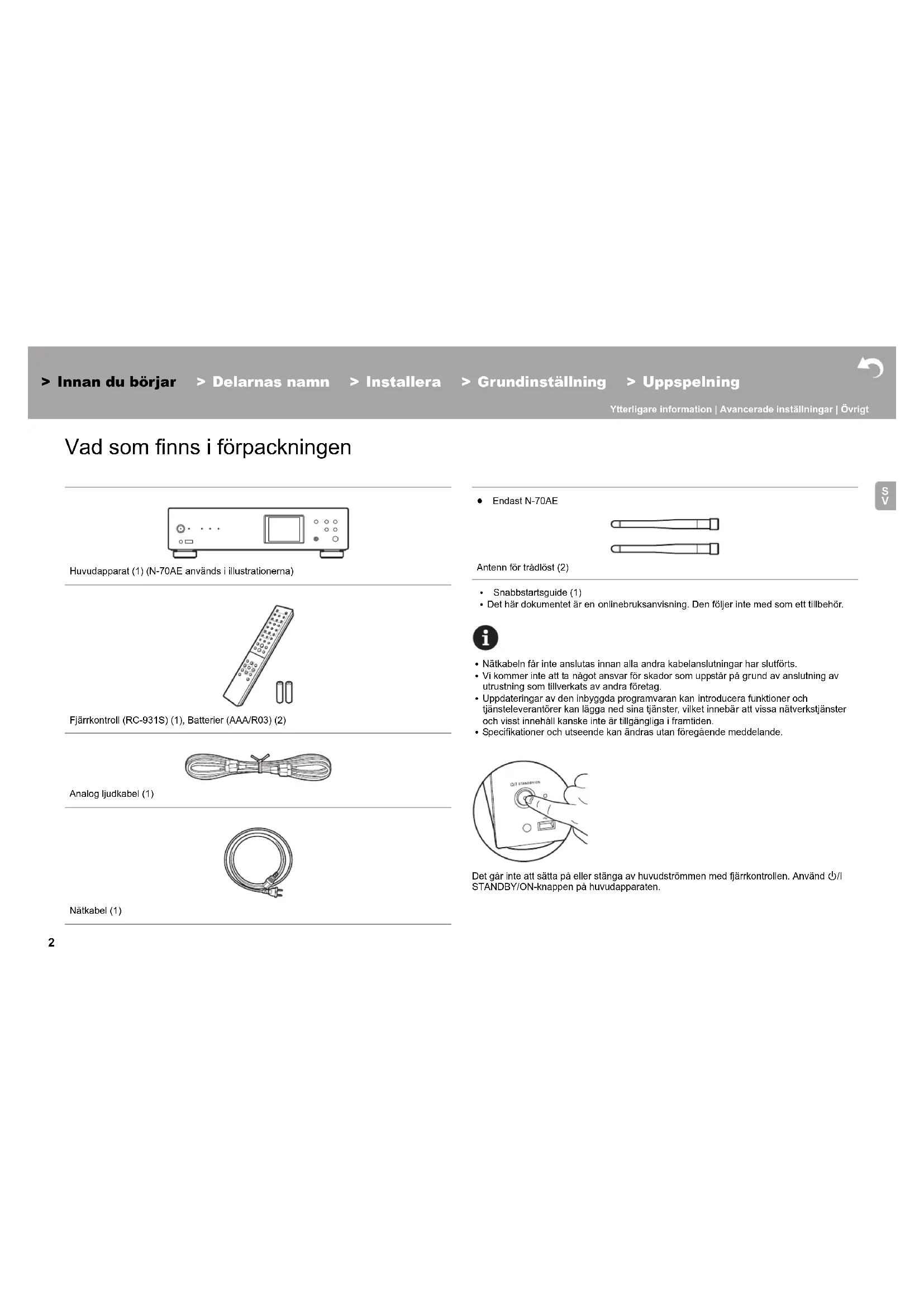 Vad som finns i förpackningen Innan du börjar 0 Nätkabeln får inte anslutas innan alla andra kabelanslutningar har slutförts. 0 Vi kommer inte att ta något ansvar för skador som uppstår på grund av anslutning av utrustning som tillverkats av andra företag. 0 Uppdateringar av den inbyggda programvaran kan introducera funktioner och tjänsteleverantörer kan lägga ned sina tjänster, vilket innebär att vissa nätverkstjänster och visst innehåll kanske inte är tillgängliga i framtiden. 0 Specifikationer och utseende kan ändras utan föregående meddelande. Det går inte att sätta på eller stänga av huvudströmmen med fjärrkontrollen. Använd Í/I STANDBY/ON-knappen på huvudapparaten. Huvudapparat (1) (N-70AE används i illustrationerna) Fjärrkontroll (RC-931S) (1), Batterier (AAA/R03) (2) Analog ljudkabel (1) Nätkabel (1) ≥ Endast N-70AE Antenn för trådlöst (2) 0 Snabbstartsguide (1) 0 Det här dokumentet är en onlinebruksanvisning. Den följer inte med som ett tillbehör.> Innan du börjar > Delarnas namn > Installera > Grundinställning > Uppspelning Ytterligare information | Avancerade inställningar | Övrigt