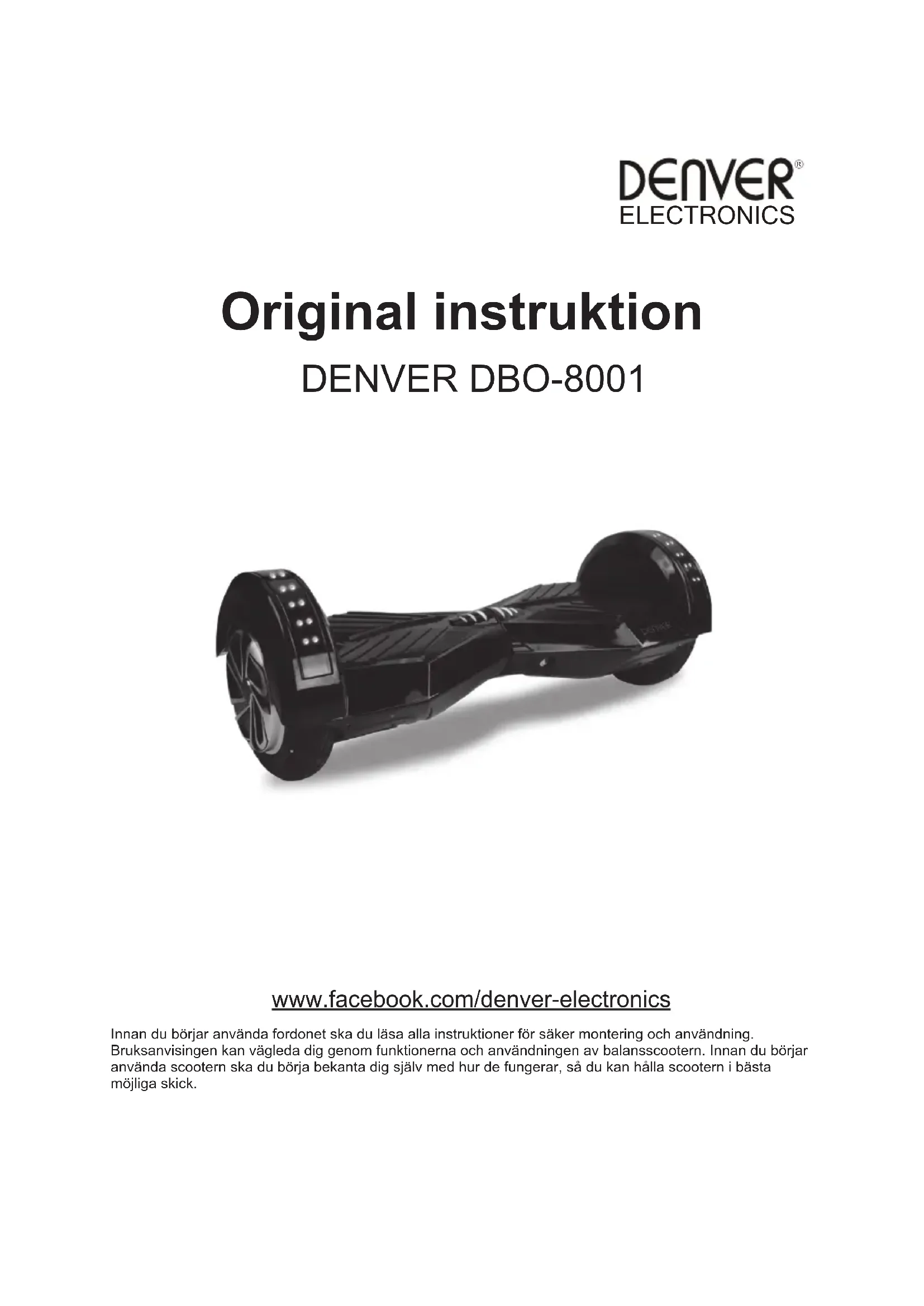 www.facebook.com/denverelectronics Dinamarca Omega 5A, Soeften, DK-8382 Hinnerup, POR 8Original instruktion DENVER DBO-8001 www.facebook.com/denver-electronics Innan du börjar använda fordonet ska du läsa alla instruktioner för säker montering och användning. Bruksanvisingen kan vägleda dig genom funktionerna och användningen av balansscootern. Innan du börjar använda scootern ska du börja bekanta dig själv med hur de fungerar, så du kan hålla scootern i bästa möjliga skick.