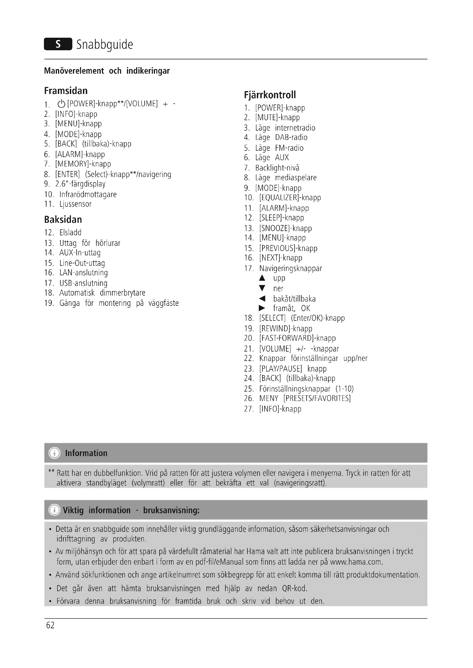 - Av miljöhänsyn och för att spara på värdefullt råmaterial har Hama valt att inte publicera bruksanvisningen i tryckt form, utan erbjuder den enbart i form av en pdf-l/eManual som nns att ladda ner på www.hama.com.
