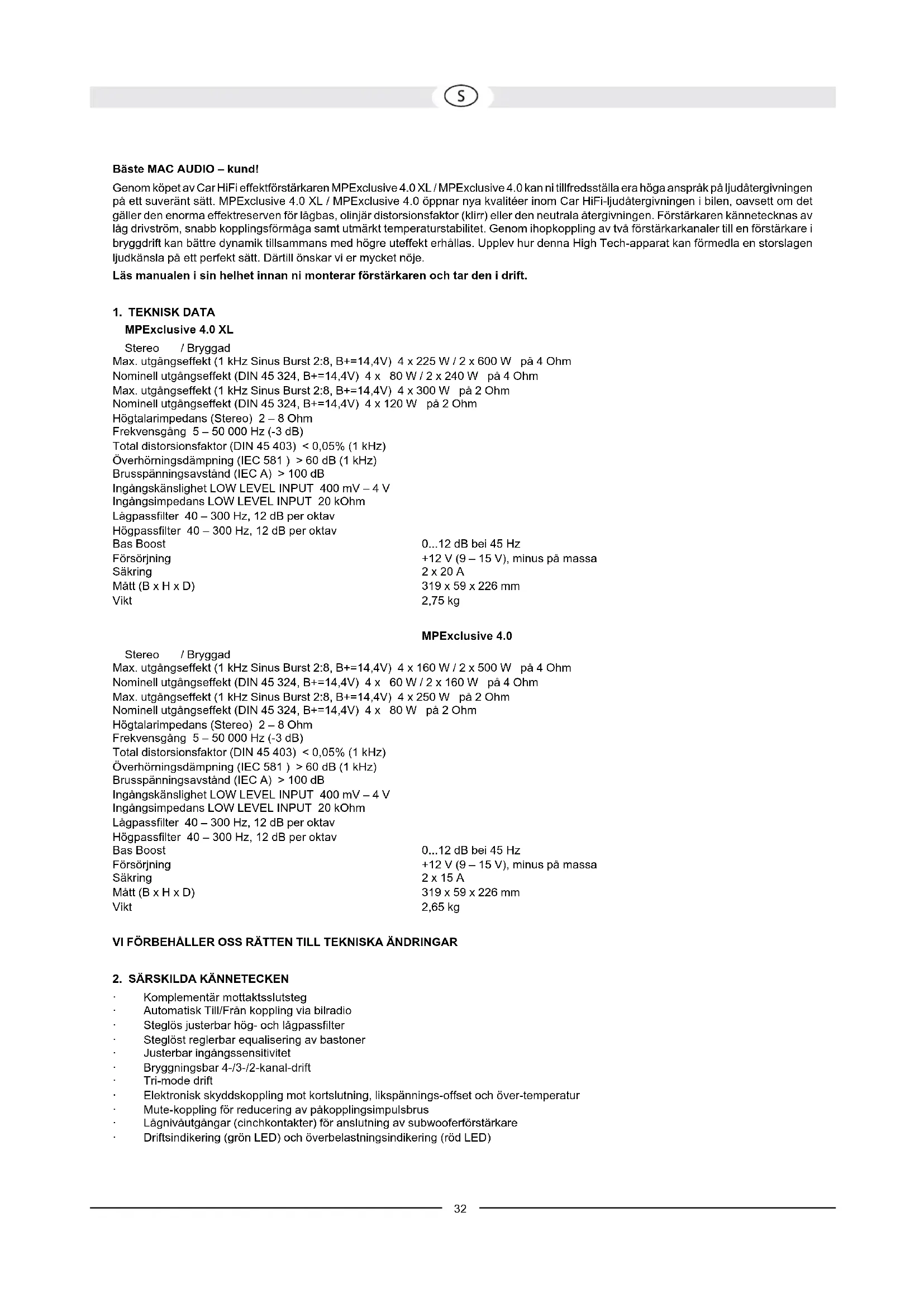 MPExclusive 4.0 XL Stereo / Bryggad Max. utgångseffekt (1 kHz Sinus Burst 2:8, B+=14,4V) 4 x 225 W / 2 x 600 W på 4 Ohm Nominell utgångseffekt (DIN 45 324, B+=14,4V) 4 x 80 W / 2 x 240 W på 4 Ohm Max. utgångseffekt (1 kHz Sinus Burst 2:8, B+=14,4V) 4 x 300 W på 2 Ohm Nominell utgångseffekt (DIN 45 324, B+=14,4V) 4 x 120 W på 2 Ohm Högtalarimpedans (Stereo) 2 – 8 Ohm Frekvensgång 5 – 50 000 Hz (-3 dB) Total distorsionsfaktor (DIN 45 403) < 0,05% (1 kHz) Överhörningsdämpning (IEC 581 ) > 60 dB (1 kHz) Brusspänningsavstånd (IEC A) > 100 dB Ingångskänslighet LOW LEVEL INPUT 400 mV – 4 V Ingångsimpedans LOW LEVEL INPUT 20 kOhm Lågpassfilter 40 – 300 Hz, 12 dB per oktav Högpassfilter 40 – 300 Hz, 12 dB per oktav Bas Boost 0...12 dB bei 45 Hz Försörjning +12 V (9 – 15 V), minus på massa Säkring 2 x 20 A Mått (B x H x D) 319 x 59 x 226 mm Vikt 2,75 kg MPExclusive 4.0 Stereo / Bryggad Max. utgångseffekt (1 kHz Sinus Burst 2:8, B+=14,4V) 4 x 160 W / 2 x 500 W på 4 Ohm Nominell utgångseffekt (DIN 45 324, B+=14,4V) 4 x 60 W / 2 x 160 W på 4 Ohm Max. utgångseffekt (1 kHz Sinus Burst 2:8, B+=14,4V) 4 x 250 W på 2 Ohm Nominell utgångseffekt (DIN 45 324, B+=14,4V) 4 x 80 W på 2 Ohm Högtalarimpedans (Stereo) 2 – 8 Ohm Frekvensgång 5 – 50 000 Hz (-3 dB) Total distorsionsfaktor (DIN 45 403) < 0,05% (1 kHz) Överhörningsdämpning (IEC 581 ) > 60 dB (1 kHz) Brusspänningsavstånd (IEC A) > 100 dB Ingångskänslighet LOW LEVEL INPUT 400 mV – 4 V Ingångsimpedans LOW LEVEL INPUT 20 kOhm Lågpassfilter 40 – 300 Hz, 12 dB per oktav Högpassfilter 40 – 300 Hz, 12 dB per oktav Bas Boost 0...12 dB bei 45 Hz Försörjning +12 V (9 – 15 V), minus på massa Säkring 2 x 15 A Mått (B x H x D) 319 x 59 x 226 mm Vikt 2,65 kg VI FÖRBEHÅLLER OSS RÄTTEN TILL TEKNISKA ÄNDRINGAR