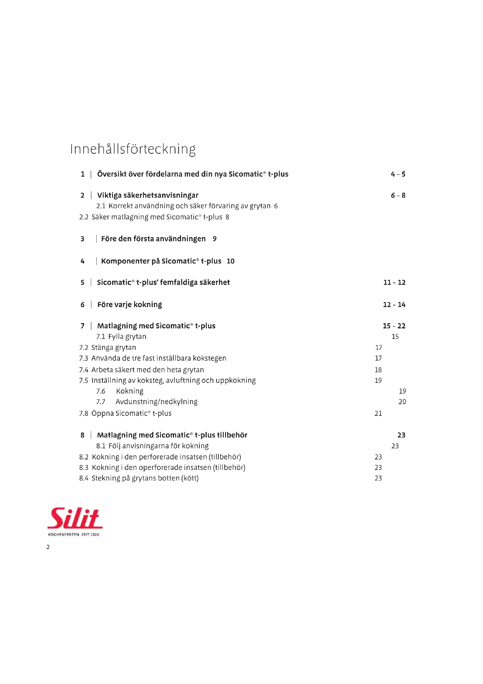 3 | Före den första användningen 9 4 | Komponenter på Sicomatic® t-plus 10 5 | Sicomatic® t-plus' femfaldiga säkerhet 11 - 12 6 | Före varje kokning 12 - 14 7 | Matlagning med Sicomatic® t-plus 15 - 22