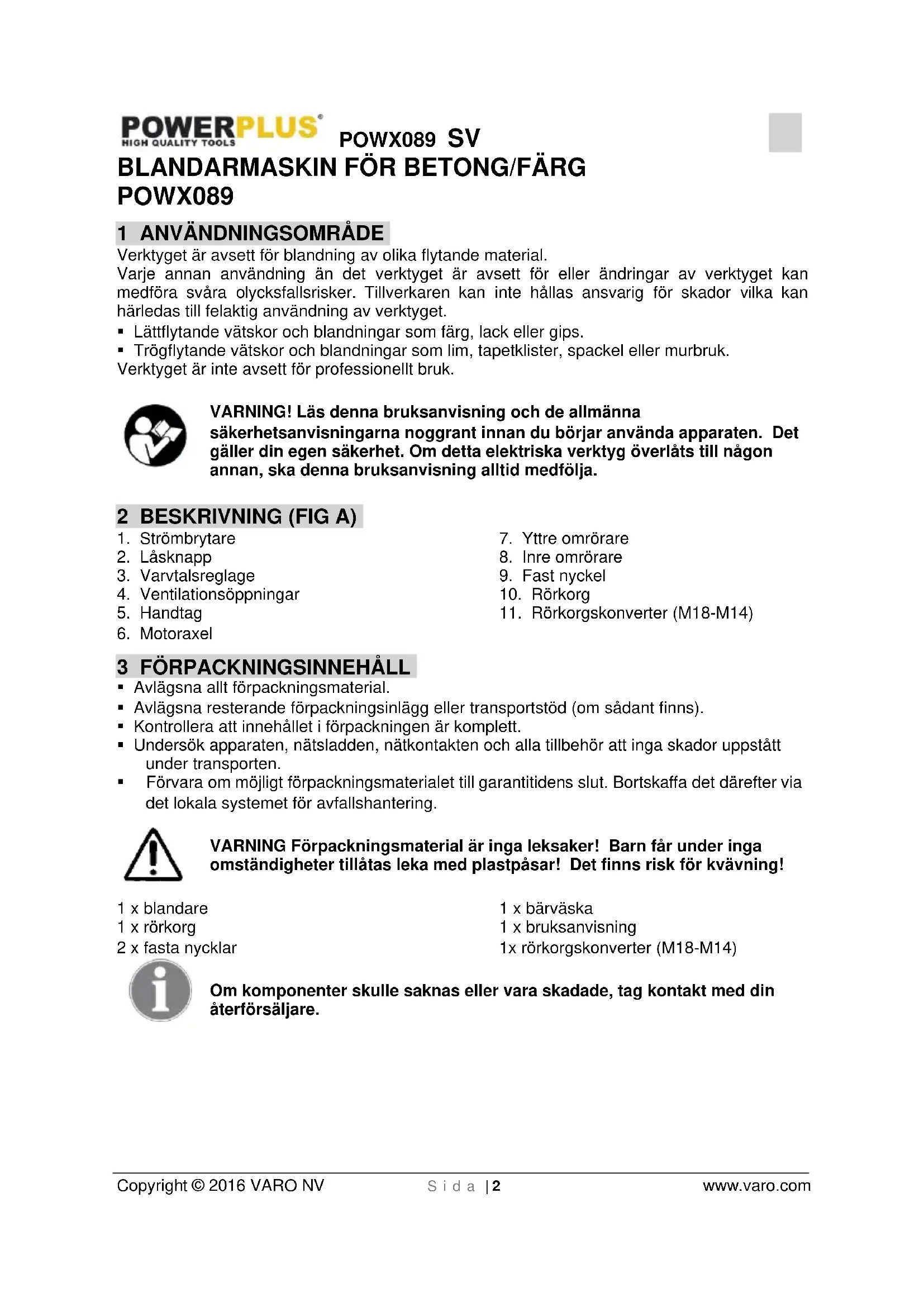 Då produkten tjänat ut får den inte lämnas med det vanliga hushållsavfallet utan ska deponeras på miljömässigt korrekt sätt och enligt gällande lokala bestämmelser. Avfall som kommer från elektriska maskinkomponenter får inte hanteras som vanligt hushållsavfall. De ska deponeras för återvinning där återvinningscentraler finns att tillgå. Kontakta lokala myndigheter eller din återförsäljare för närmare information om återvinning. 15 KONFORMITETSDEKLARATION VARO N.V. – Joseph Van Instraat 9 – BE2500 Lier – Belgien, deklarerar härmed att, Utrustningens beteckning : Blandarmaskin För Betong/Färg Fabrikat : POWERplus Modell : POWX089 överensstämmer med väsentliga krav och andra relevanta bestämmelser i tillämpliga Europeiska direktiv, baserat på tillämpningen av Europeiska harmoniserade standarder. Varje ej godkänd ändring av apparaten gör denna deklaration ogiltig. Europeiska direktiv (inklusive, i tillämpliga fall, ändringar till dessa, fram till dagen för undertecknandet); 2014/30/EU 2006/42/EC 2011/65/EU Europeiska harmoniserade standarder (inklusive, i tillämpliga fall, ändringar till dessa, fram till dagen för undertecknandet); EN60745-1 : 2009 EN55014-1 : 2006 EN55014-2 : 1997 EN61000-3-2 : 2014 EN61000-3-3 : 2013 Ansvarig för den tekniska dokumentationen: Philippe Vankerkhove, VARO - Vic. Van Rompuy N.V. Undertecknad agerar på uppdrag av företagets VD, Hugo Cuypers Tillämpningsansvarig - Registrerings- och regelfrågor Datum: 01/12/2016POWX089 FI Copyright © 2016 VARO NV S i v u | 1 www.varo.com 1 KÄYTTÖ .......................................................................................... 2