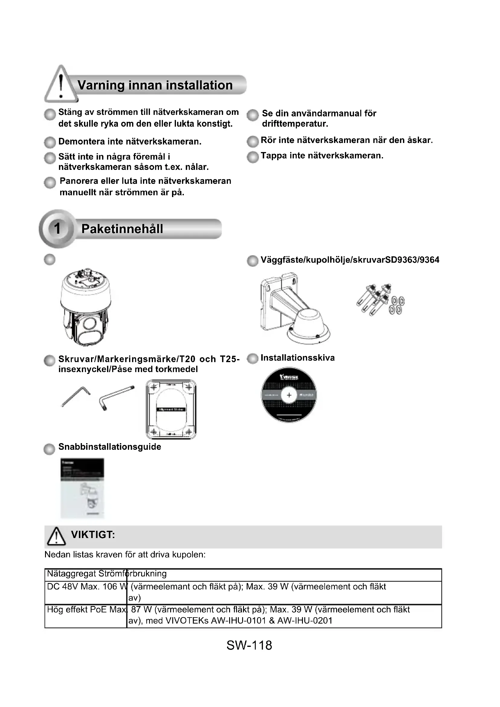Installationsskiva Snabbinstallationsguide Skruvar/Markeringsmärke/T20 och T25- insexnyckel/Påse med torkmedel VIKTIGT: Nedan listas kraven för att driva kupolen: Nätaggregat Strömförbrukning DC 48V Max. 106 W (värmeelemant och äkt på); Max. 39 W (värmeelement och äkt av) Hög effekt PoE Max. 87 W (värmeelement och äkt på); Max. 39 W (värmeelement och äkt av), med VIVOTEKs AW-IHU-0101 & AW-IHU-0201SW-119 Svenska Fysisk beskrivning